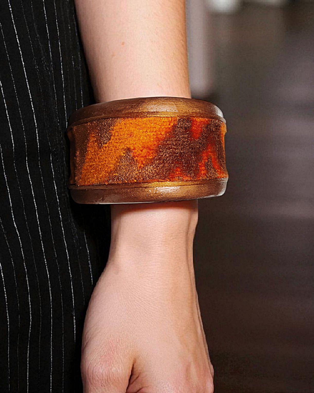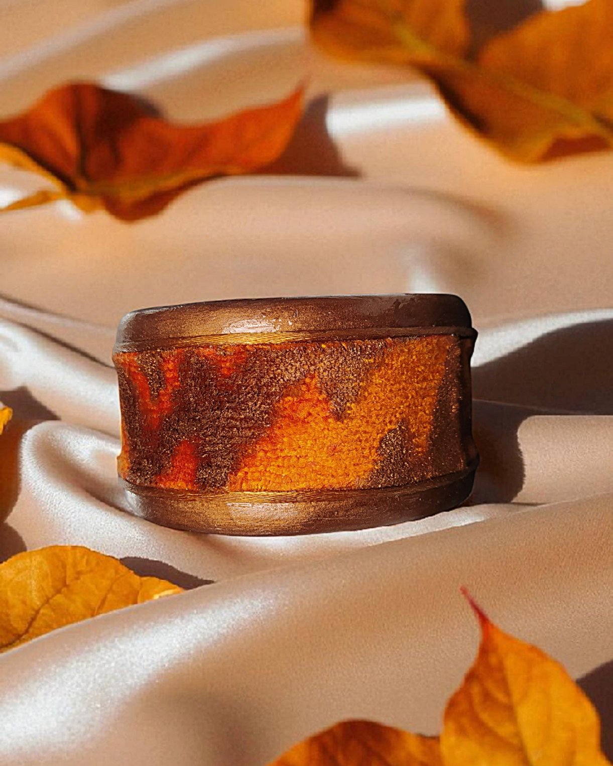 Celebrate the warmth of fall with this handmade papier-mâché bangle —waterproof, impact-resistant, and rich in fiery autumn tones.
