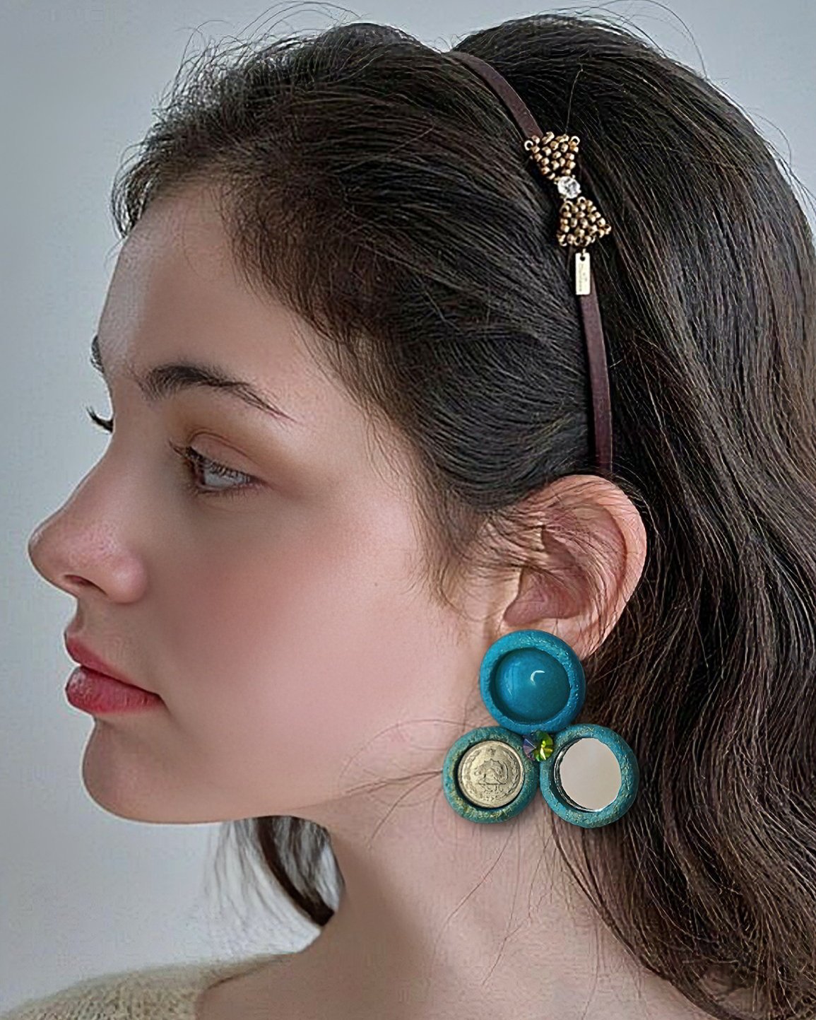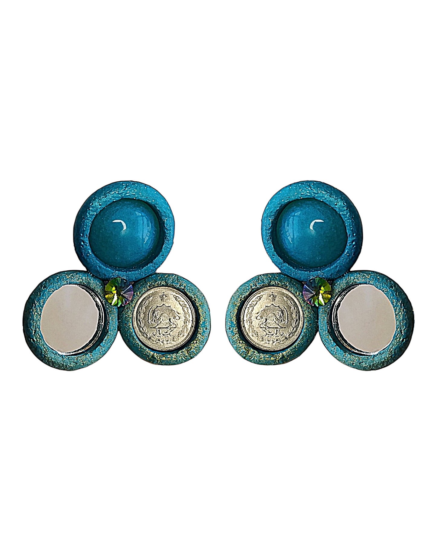 Step into a world where history whispers through design. These handcrafted earrings are a poetic fusion of past and present, featuring a base of lightweight papier-mâché adorned with reflective mirror discs, a luminous resin gemstone, and a vintage Pahlavi coin. Each element is carefully placed to evoke symmetry, emotion, and timeless elegance. The turquoise top circle adds a pop of color, while the silver mirrors catch the light with every movement—making these earrings not just accessories, but storytellers. Perfect for lovers of mixed-media jewelry and symbolic fashion, this pair speaks to those who value depth in design. Whether styled with minimalist outfits or layered with bold textures, these earrings elevate your look with a touch of Persian heritage and contemporary flair. Ideal for editorial shoots, statement styling, or gifting to someone who appreciates wearable art. Lightweight yet impactful, they’re a tribute to craftsmanship, memory, and the power of visual storytelling.
