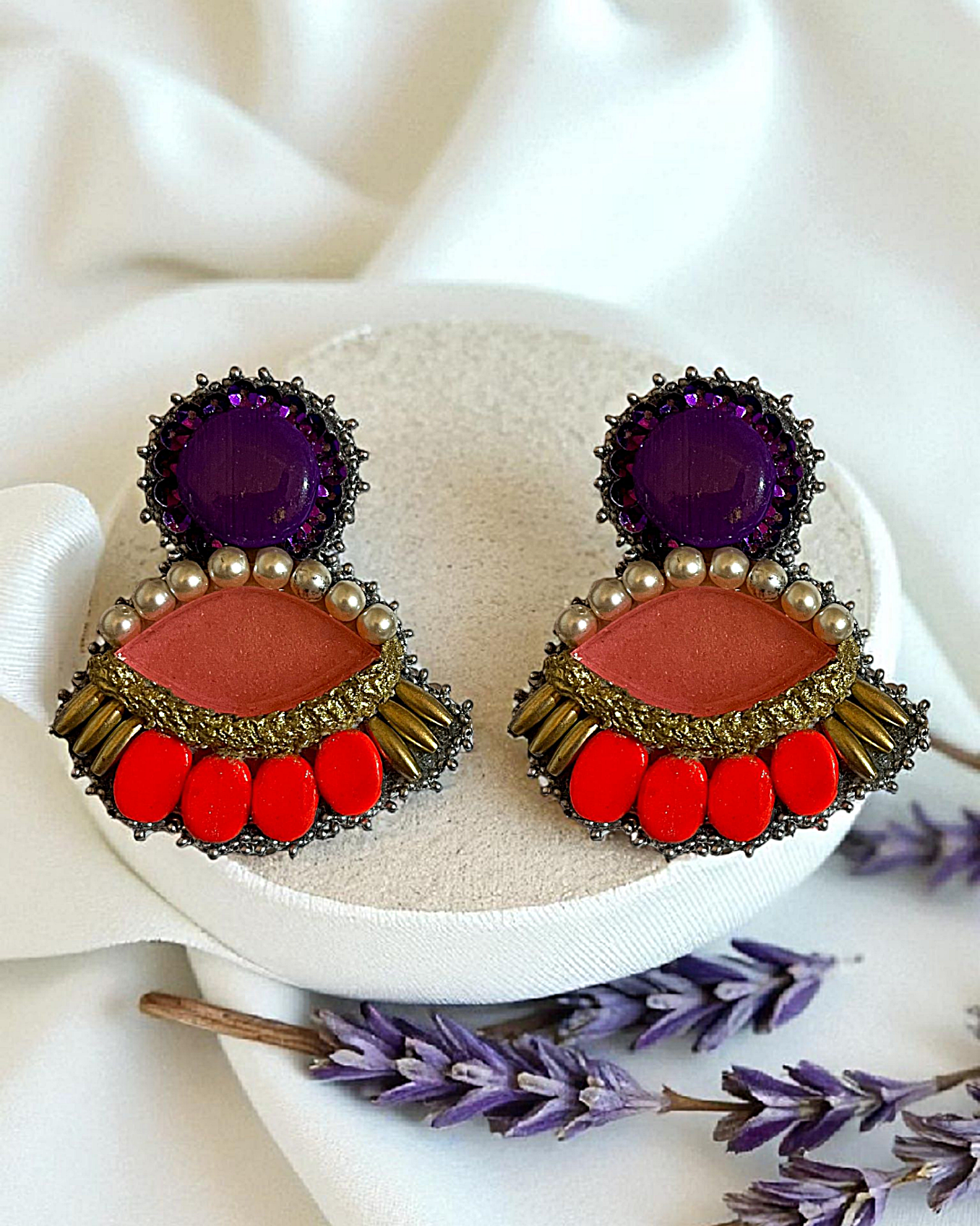 Step into a world of vibrant storytelling with the Ābanāt earrings—a celebration of handcrafted beauty and cultural nostalgia. Inspired by the timeless art of dangle jewelry, each piece features a harmonious blend of textures and hues: a regal purple gem crowned with metallic beads, delicate white pearls, and a cascade of pink and red resin stones that evoke the sweetness of traditional confections. These earrings are more than accessories—they’re wearable poetry. Crafted with hand-poured resin stones and designed to capture the essence of festive elegance, Ābanāt earrings are perfect for those who seek bold expression with a touch of whimsy. Whether paired with traditional attire or styled as a statement piece in contemporary fashion, their layered composition and symbolic color palette make them unforgettable. Ideal for gifting or self-adornment, they speak to the soul of anyone who cherishes artful storytelling through jewelry.