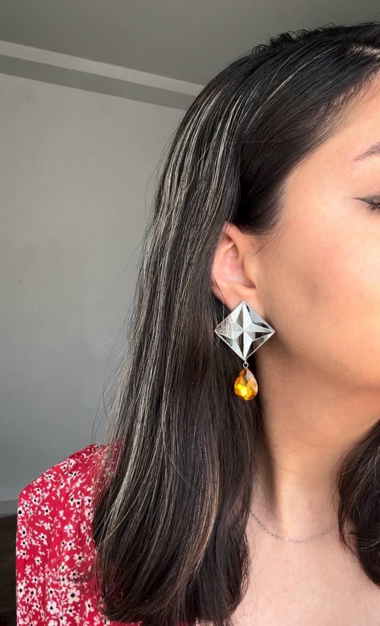 Handcrafted with fine mirror pieces, pulp, and high-quality teardrop gemstones, Charao blends sharp form with delicate sparkle. At the base of each earring, a teardrop-shaped gem gently dangles, adding a vivid and graceful dimension to the overall design.