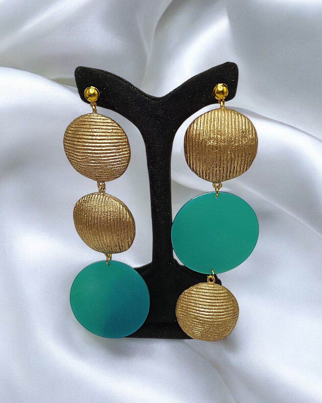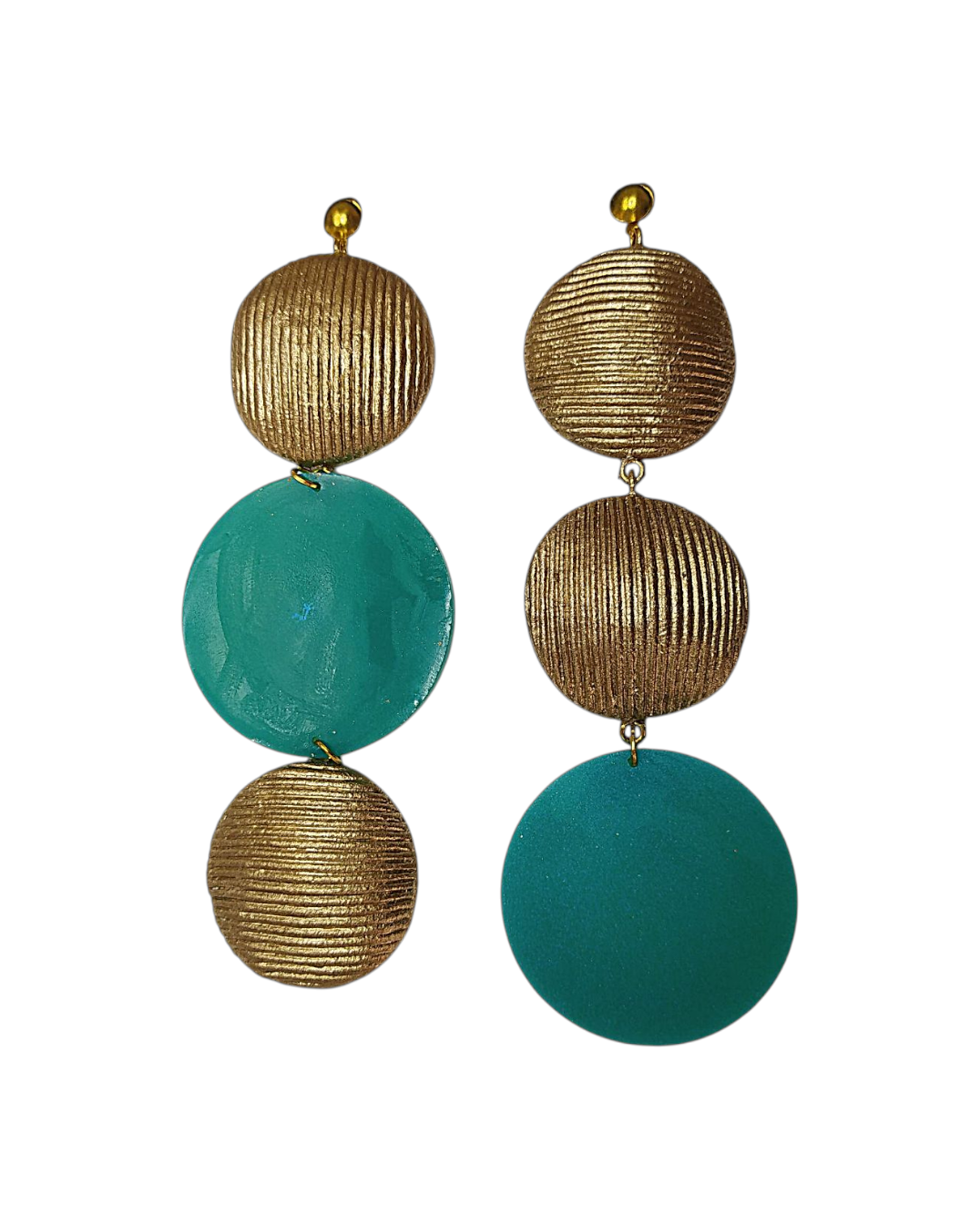 Handcrafted papier-mâché earrings enhanced with turquoise resin circles and gold metallic powder. Ultra-light, artistic, and designed for effortless everyday elegance.