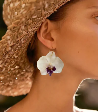 Handmade Real Dendrobium Orchid Hoop Earrings On Model