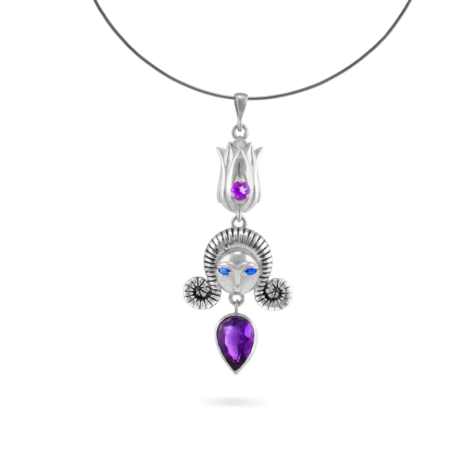 Limited Edition. Discover the Gold Plated Silver Pendant Dokhtaran-e-Dasht-e-Dagh, crafted from gold-plated silver and adorned with vibrant amethyst and sapphire gemstones. Inspired by cultural heritage, these elegant earrings blend tradition with modern style—perfect for gifting or special occasions.