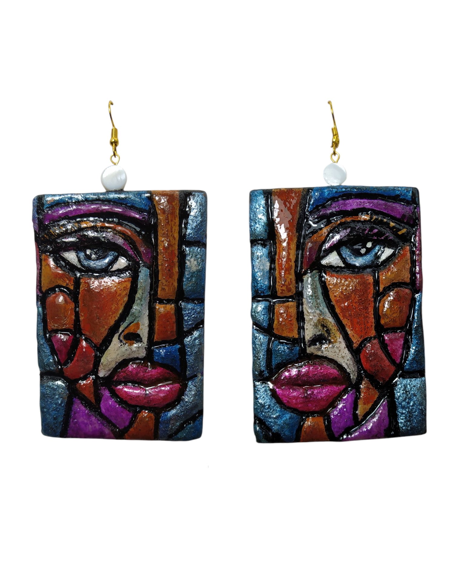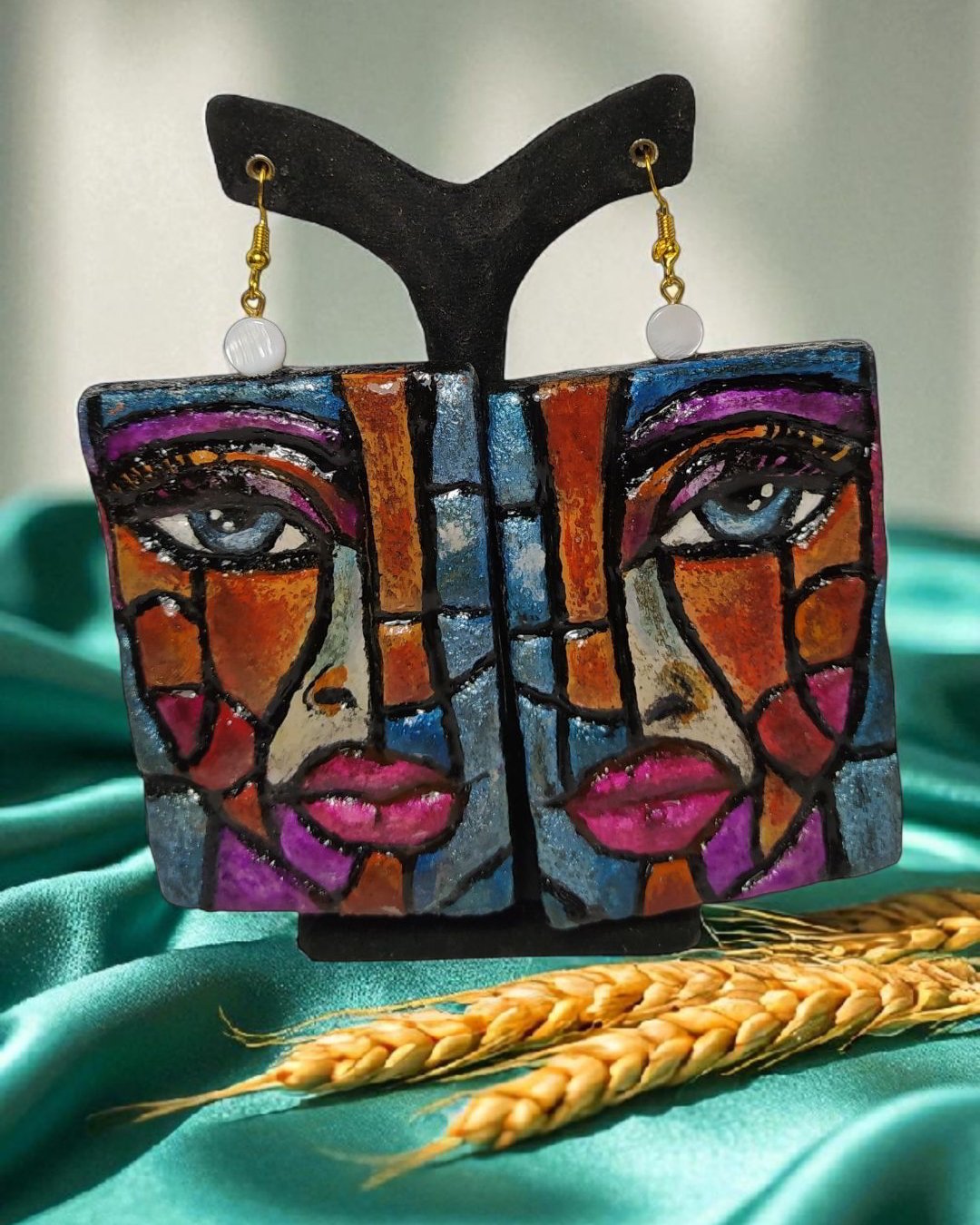 Step into a world where jewelry becomes poetry. The Dual-Face earrings are a striking fusion of art and adornment, featuring two mirrored faces rendered in raised, hand-painted detail. Each earring tells a story of duality—of reflection and contrast—through expressive eyes, sculpted lips, and a mosaic of deep blues, purples, and earthy browns. The glossy finish enhances the emotional texture, while the top is crowned with a luminous mother-of-pearl stone, adding a celestial touch to the composition. Designed for those who see fashion as a form of storytelling, these earrings are more than accessories—they’re wearable portraits. The symmetry between the two faces evokes themes of inner dialogue, twin souls, and mirrored emotions. Whether styled with minimalist outfits or layered into maximalist looks, they command attention while whispering mystery. Perfect for artists, dreamers, and collectors of symbolic beauty, this piece bridges the gap between sculpture and style.