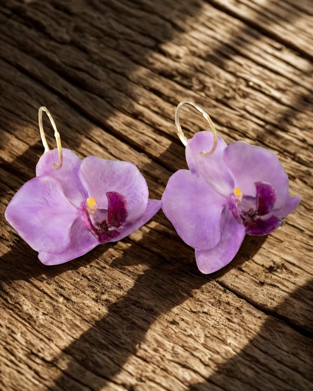 Real miniature purple Phalaenopsis orchid sealed in UV resin, lightweight, design with 18K gold-plated silver hoop, perfect for daily use, wedding and date use.