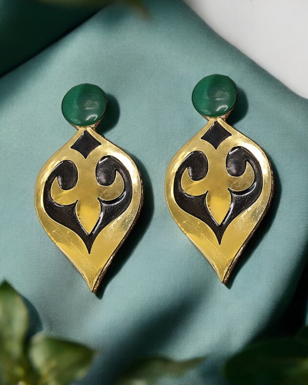 Inspired by the timeless silhouette of the cypress tree—Sarv Mandegar—these handcrafted earrings embody resilience, grace, and poetic endurance. Each piece is a harmonious blend of papier-mâché wood, supple leather, and multistyle layering, meticulously painted with gold powder to evoke a sense of regal antiquity. The teardrop-shaped base features intricate black motifs that echo Persian floral geometry, while the green stud adds a touch of organic vitality, grounding the design in nature’s palette.  Designed for those who seek meaning in every detail, these earrings are featherlight yet visually bold—perfect for festive gatherings, gallery nights, or intimate storytelling moments. Their mixed-media construction speaks to the fusion of tradition and innovation, making them not just accessories but wearable narratives. Whether paired with minimalist attire or layered textures, Eternal Cypress earrings elevate your look with symbolic depth and radiant craftsmanship.