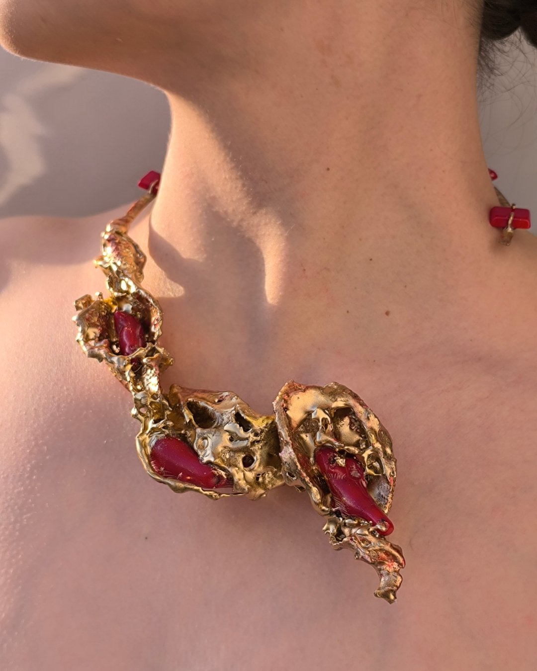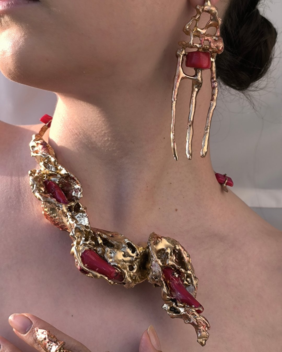 this jewelry collection is as indefinable as the postmodernism and is taken from the most private states and inner sensitivities of a woman in today’s society and in the entire history of the feminine existence.The different and beautiful design of this work can help you have a special style.The Gold Red Necklace (Code: M-H17-1) is a stunning fusion of color, artistry, and sophistication.Lightweight and comfortable, this necklace is ideal for all-day wear, effortlessly complementing both casual and formal ensembles. Each pair is unique, reflecting the artisan’s careful attention to detail and commitment to handcrafted excellence.Perfect as a thoughtful gift or a personal statement piece, the Gold Red Necklace (Code: M-H17-1) bring creativity, elegance, and artisanal charm to any jewelry collection. Their luxurious color combination, versatile design, and handcrafted quality make them a standout accessory that celebrates individuality, style, and refined craftsmanship.