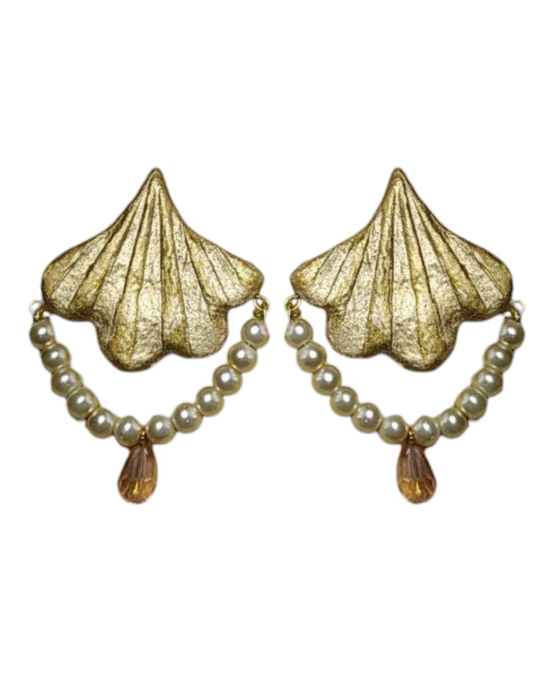 Lightweight earrings featuring gold-painted papier-mâché Ginkgo leaves, pearl accents, and amber drops—crafted for poetic elegance.