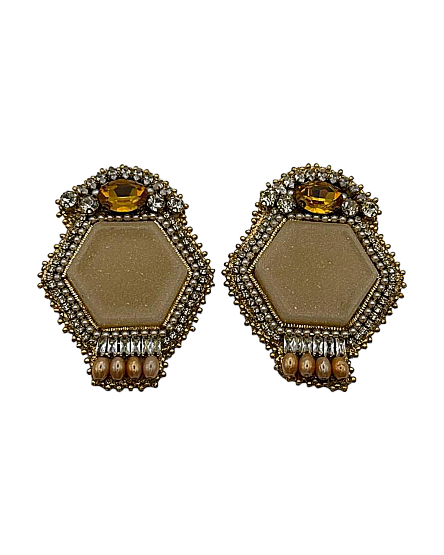 Step into the world of refined craftsmanship with the Golden Honey – Handmade Jewel-Embroidered Earrings—a radiant fusion of traditional bead embroidery and modern elegance. At the heart of each earring lies a hexagonal resin stone, hand-poured to evoke the warm, golden tones of honey. This centerpiece is framed by shimmering crystals that reflect light with every movement, creating a luminous halo effect that enhances the earring’s intricate design. Above the resin stone, a bold yellow crystal anchors the composition, while delicate pearl-like beads cascade below, adding softness and grace. These earrings are more than accessories—they’re wearable art. Whether paired with evening attire or used to elevate a casual look, the Golden Honey Earrings offer timeless charm and a touch of luxury. Designed for those who appreciate detail, symbolism, and the glow of handcrafted beauty.
