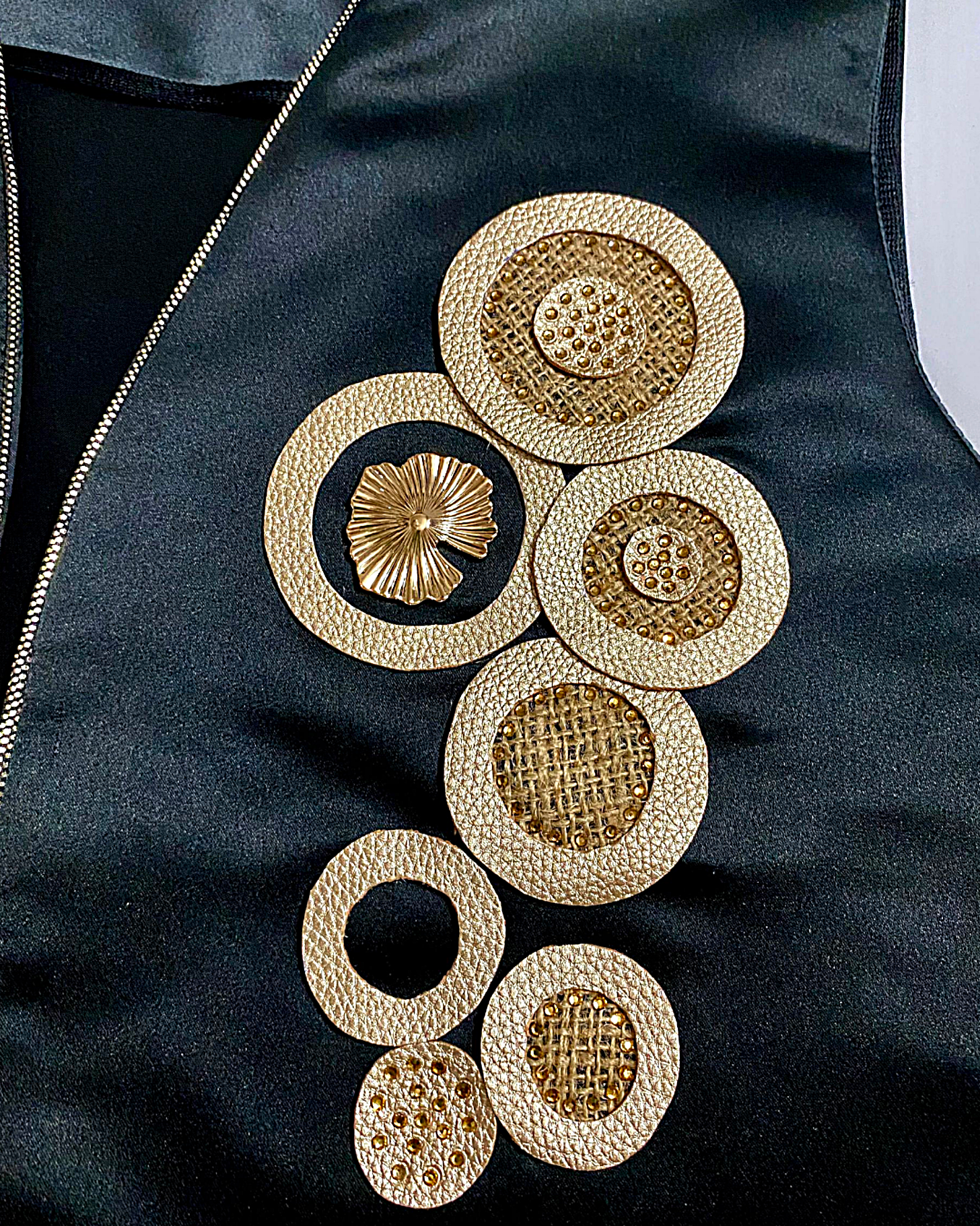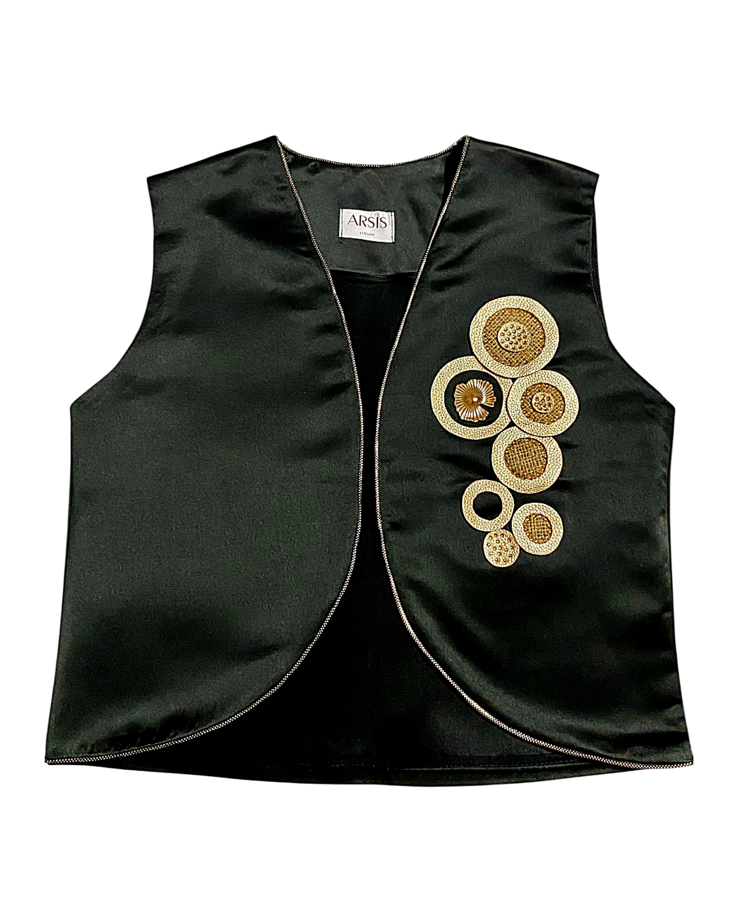 A sleeveless black satin vest adorned with handcrafted golden circles, leather accents, and braid-trimmed edges. A bold fusion of texture and symbolism.