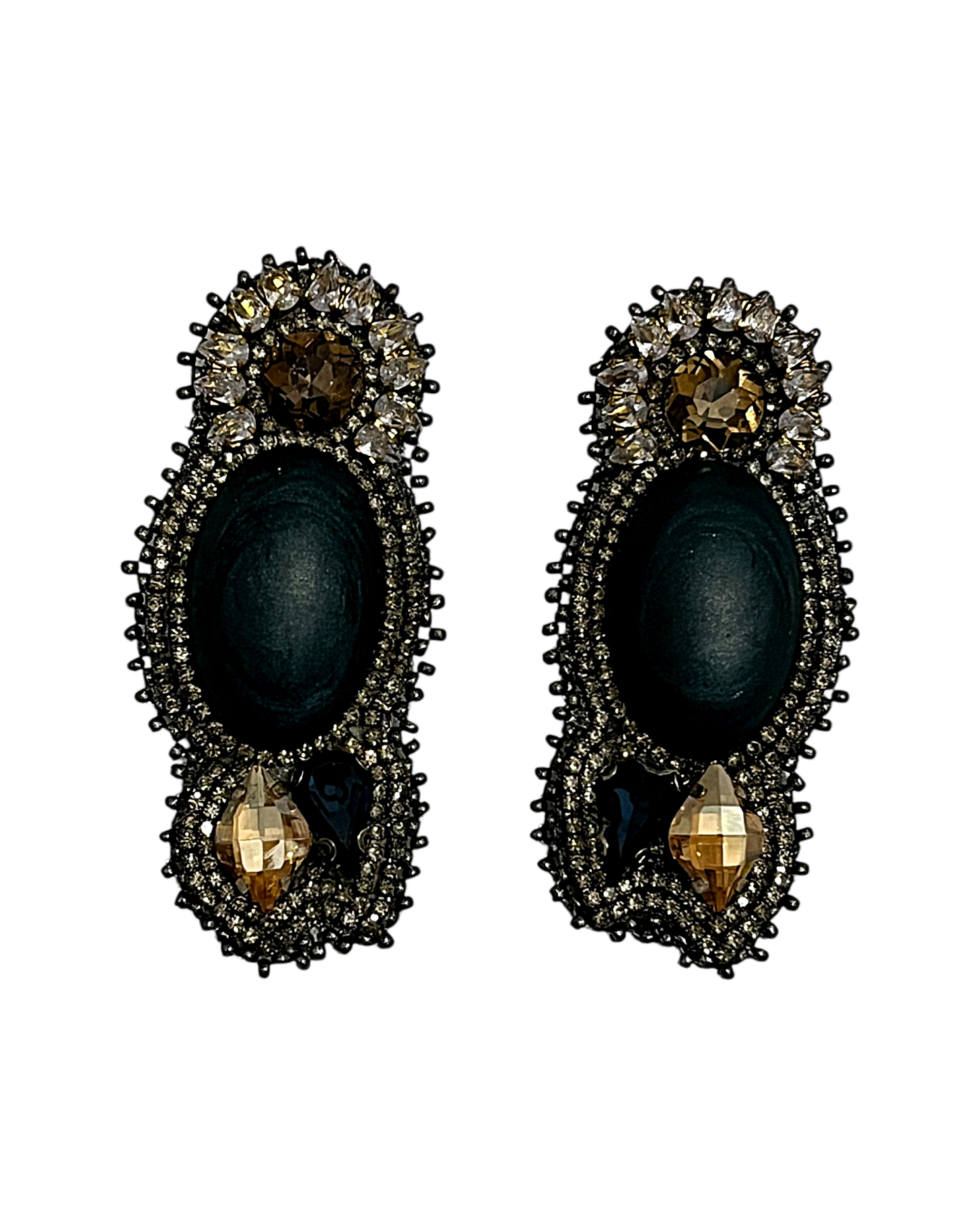 Step into a world of quiet opulence with the Gray Royalty Earrings, a pair of handcrafted statement pieces that blend vintage allure with modern artistry. Each earring showcases a bold black resin centerpiece, framed by intricate beadwork and shimmering crystal accents. The elongated silhouette and symmetrical composition evoke a sense of regal grace, while the contrast between deep tones and light gemstones adds depth and drama to every angle.  Designed for those who appreciate symbolic elegance and emotional resonance, these earrings are more than accessories—they’re wearable stories. Perfect for evening wear, gallery openings, or poetic self-expression, the Gray Royalty Earrings elevate any look with their handcrafted textures and timeless sophistication. Whether styled with minimalist fashion or layered with other statement pieces, they remain unmistakably unique—just like the soul who wears them.