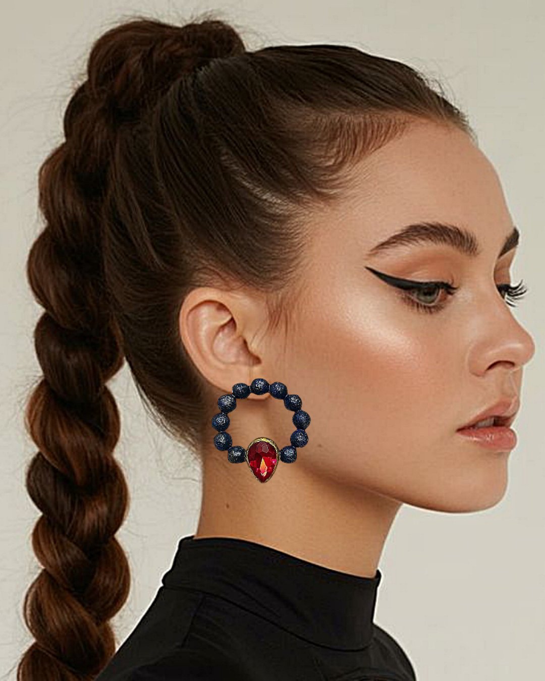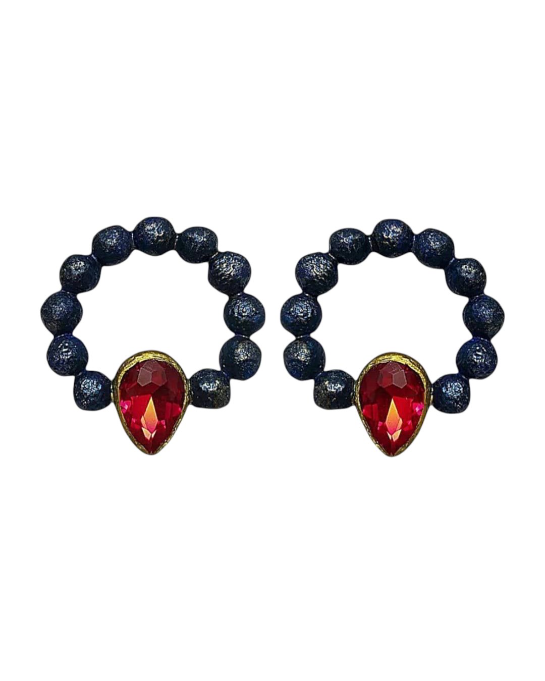 Step into a world of celestial elegance with these handcrafted earrings, sculpted from lightweight papier-mâché and painted in rich, patina-kissed hues. The circular arrangement of deep blue beads evokes the mystery of a midnight sky, while the teardrop-shaped red crystal at the base adds a striking contrast—like a falling star caught in motion. Each piece is meticulously hand-painted and aged with subtle patina techniques, giving it a timeless, artisanal feel that blends ancient charm with modern flair.  Despite their bold visual impact, these earrings are feather-light, making them ideal for all-day wear. The high-quality crystal teardrops are set in gold-toned bezels, adding a touch of luxury and warmth. Their handcrafted nature ensures that no two pairs are exactly alike—each one carries the fingerprint of the artist and the story of its creation. Perfect for lovers of symbolic jewelry, nature-inspired design, and poetic fashion statements, these earrings are more than accessories—they’re wearable art.