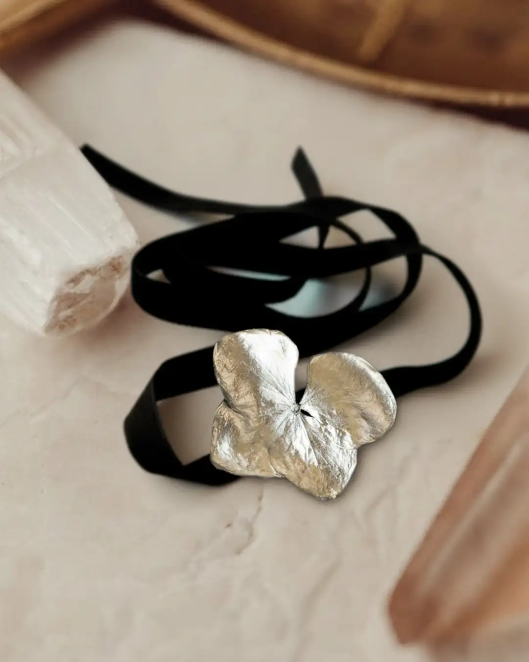 The black velvet ribbon that holds the pendant adds an intentional contrast: where silver glows, black absorbs. Black, the color of mystery and silence, becomes the canvas for the flower’s subtle radiance. The ribbon ties at the back of the neck, not with a clasp, but with a gentle knot—symbolizing intimacy, flexibility, and human connection.