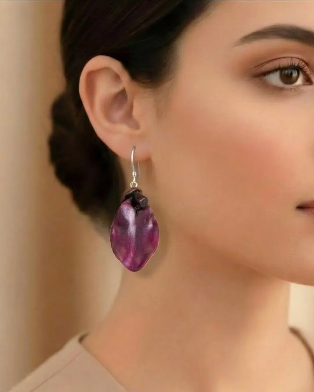 There is something powerful about wearing a real piece of nature. These handmade drop earrings are created from a preserved natural flower petal, transformed into an elegant, wearable form while keeping its original texture, curves, and organic soul intact.