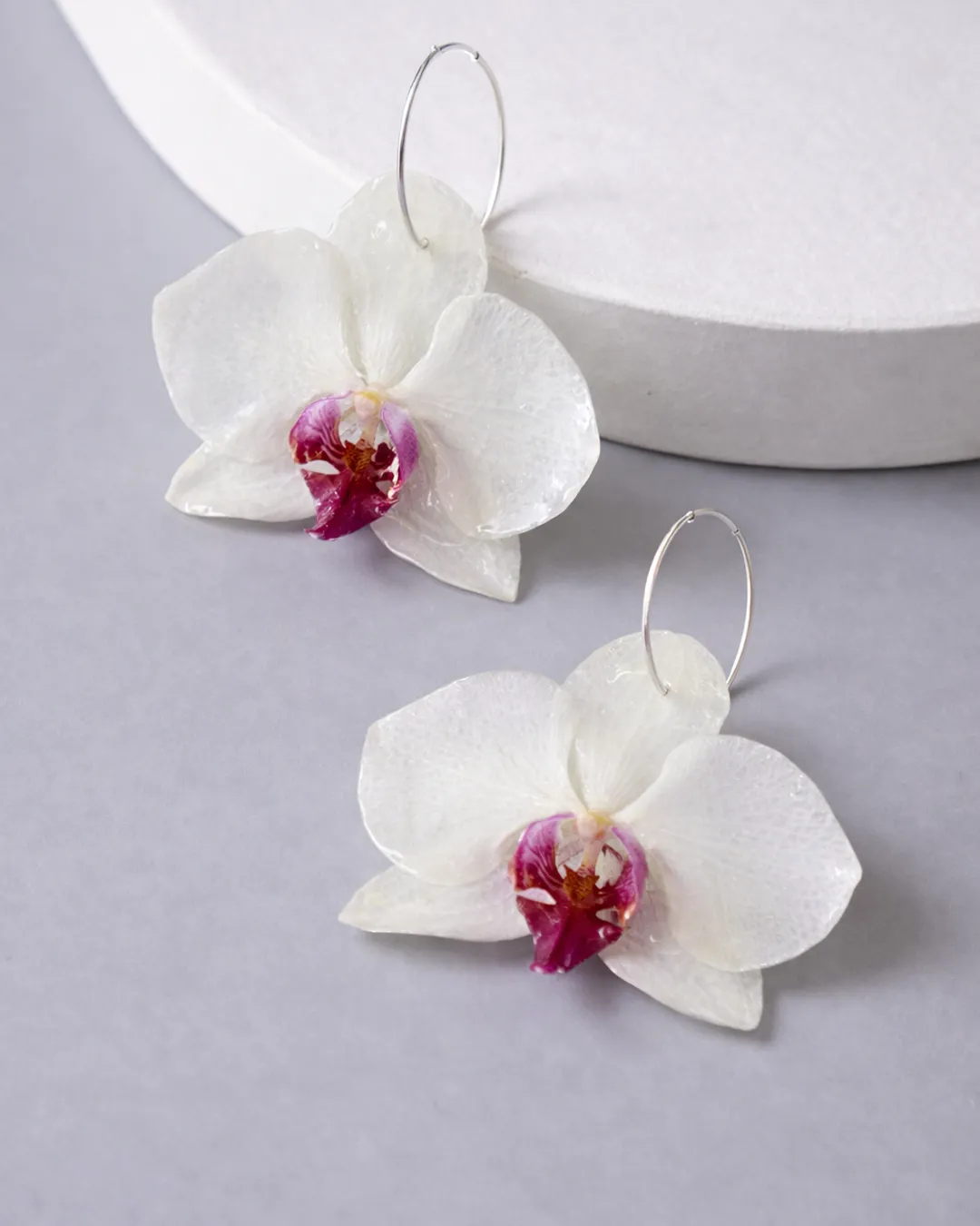 Suspended from a 3 cm silver hoop, these orchid earrings achieve perfect balance. The hoop is made from durable silver and adds a touch of shine without overpowering the orchid. The contrast between the organic softness of the orchid and the sharp lines of the hoop creates a visually appealing dynamic.
