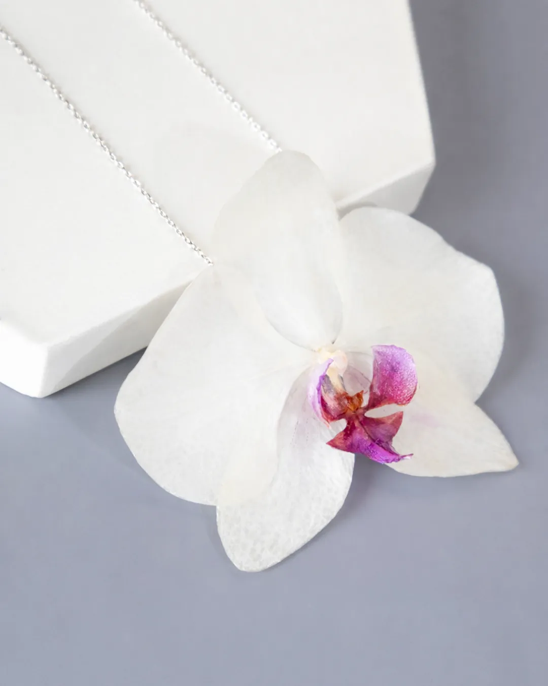 Among the countless flowers in nature, the orchid always stands apart — quiet, noble, and breathtaking. This necklace captures that fleeting beauty and preserves it in a form that endures. It is not simply jewelry; it is a living memory of nature, carefully transformed into wearable art.