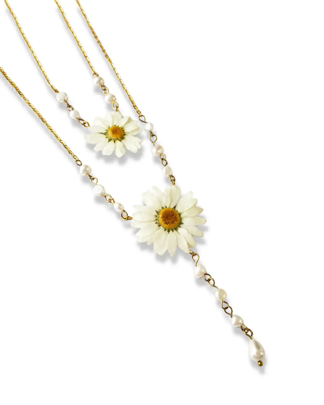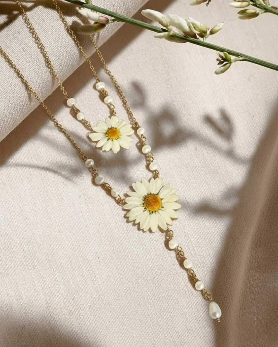 Handmade Resin Real Flower Necklace, Pearl Necklace-Handmade Daisy flower and pearl necklace, featuring a two-layer design. Perfect for April birthdays, nature lovers, and those seeking unique, elegant jewelry.