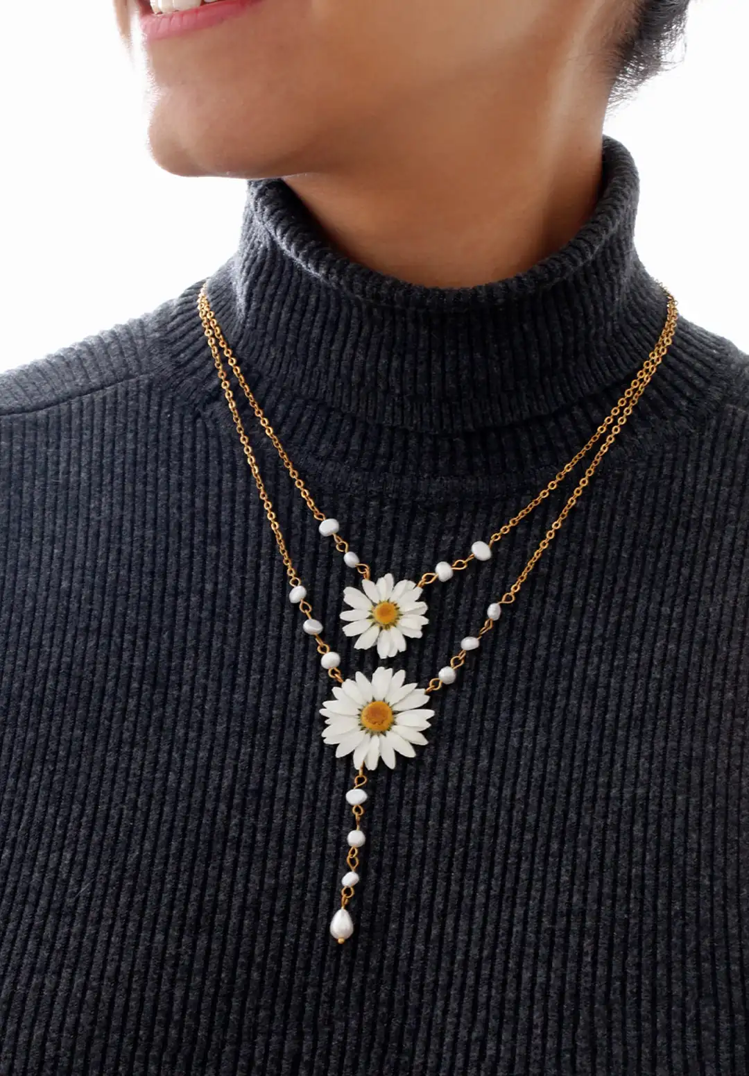 One of the distinctive features of this necklace is its two-layered design. The two separate but interconnected chains can be worn individually or together. The upper layer, with daisies and small pearls, represents the simplicity and beauty of life. The lower layer, with the teardrop-shaped pearl, symbolizes deeper emotions and inner transformation. These two layers together reflect the balance of external beauty and internal depth, providing a sense of harmony.
