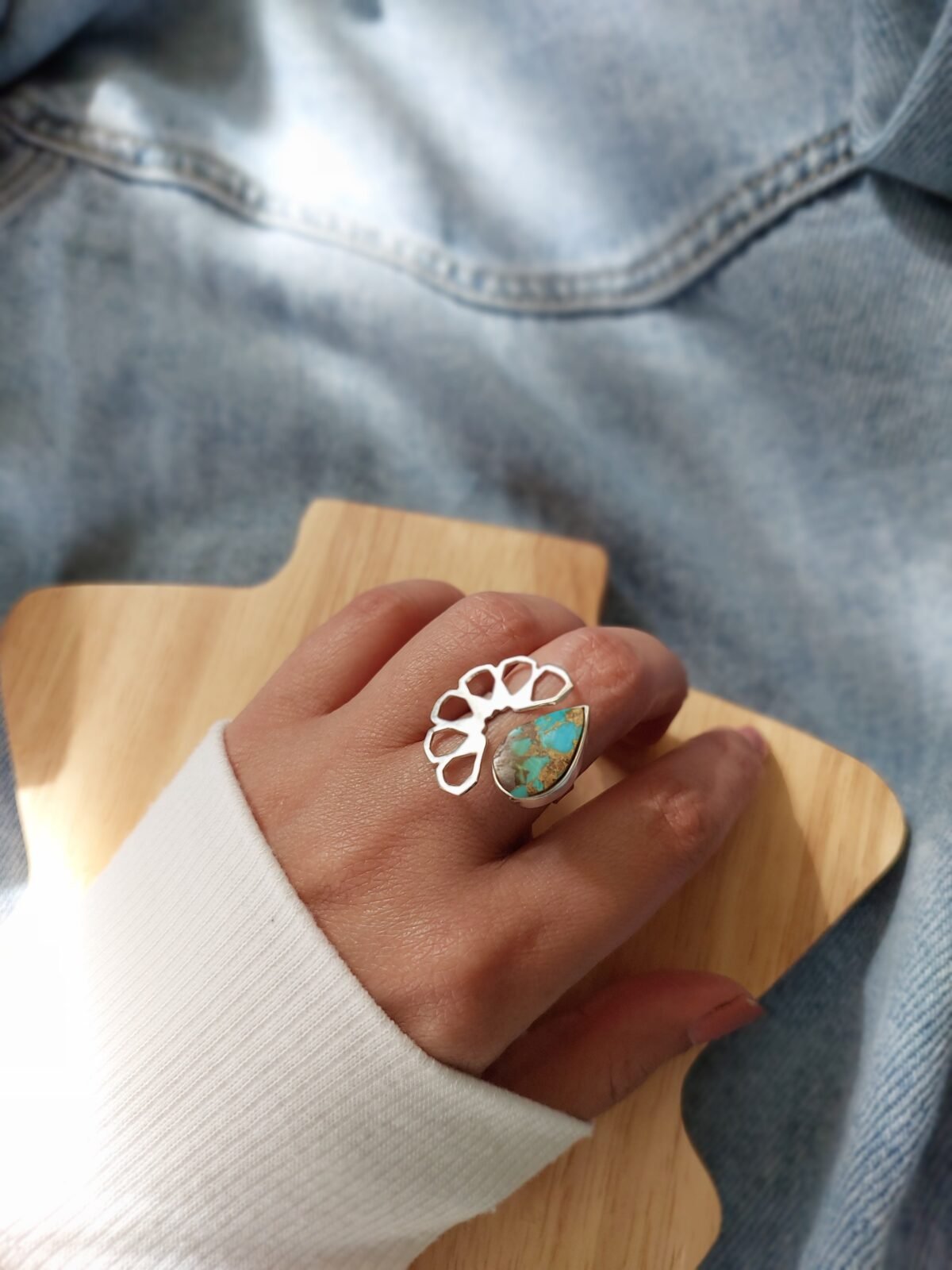 Shamsa Ring with Turquoise This ring is a blend of sacred symbolism and aesthetic beauty. The sun-inspired Shamsa, paired with the divine color of turquoise, creates a meaningful adornment that is both eye-catching and soul-soothing. Wearing it is like carrying a ray of divine light with you at all times.