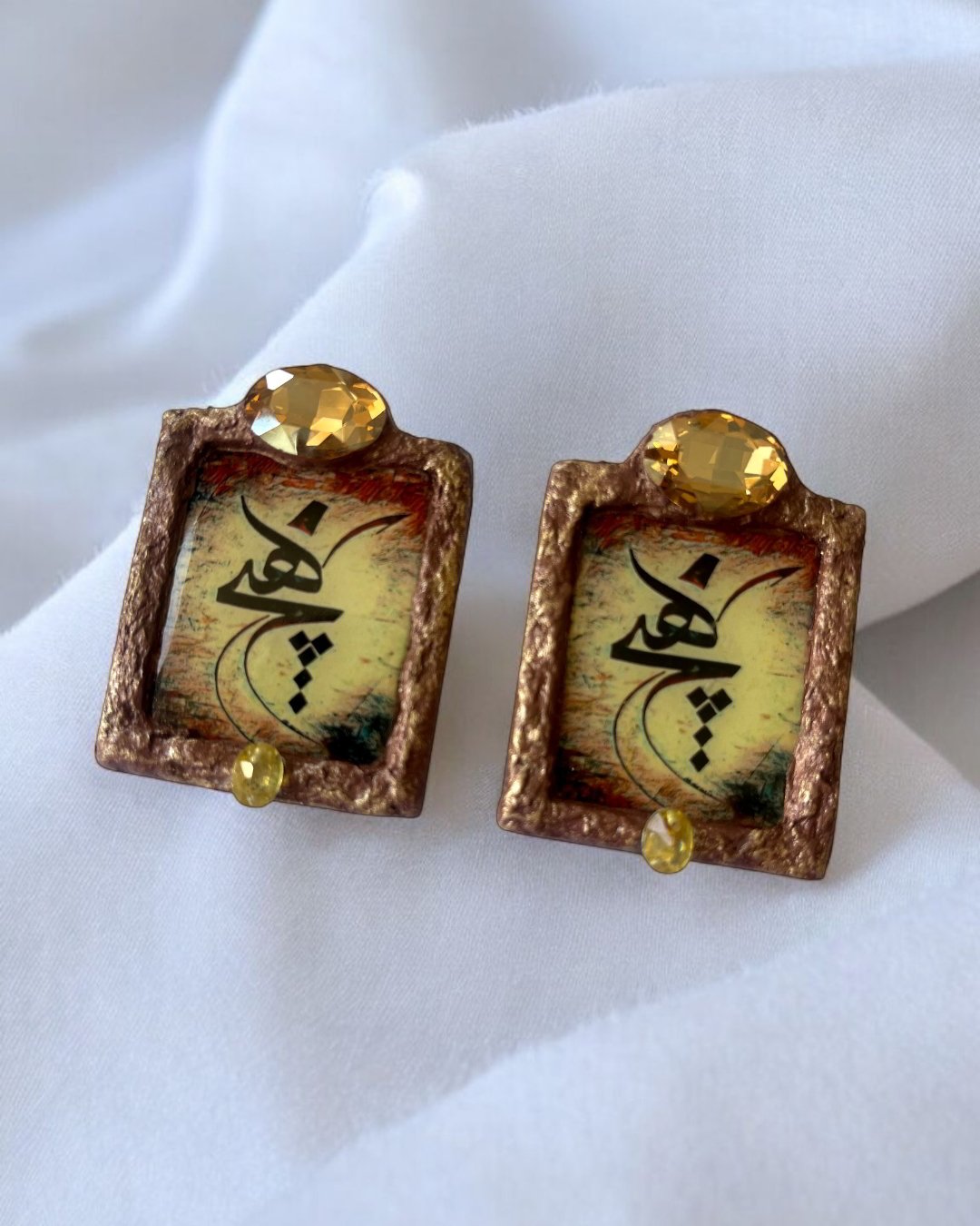 Step into the realm of poetic elegance with this handcrafted jewelry set, featuring a pendant necklace and matching earrings made using the delicate art of papier-mâché. Each piece is framed in a textured bronze-like border and showcases stylized Arabic calligraphy on a warm, parchment-toned background. The design evokes a sense of timeless mystery, enhanced by the sparkle of faceted yellow crystal stones that catch the light with every movement. Despite its intricate appearance, the set is remarkably lightweight—perfect for everyday wear or special occasions. This “Hich” set is more than an accessory; it’s a wearable philosophy. Inspired by the concept of nothingness in Persian art and poetry, it invites reflection and serenity. The fusion of traditional calligraphy with modern materials creates a unique statement piece that bridges cultures and eras. Ideal for lovers of symbolic jewelry, minimalist design, and meaningful craftsmanship, this set speaks to the soul while adorning the body.