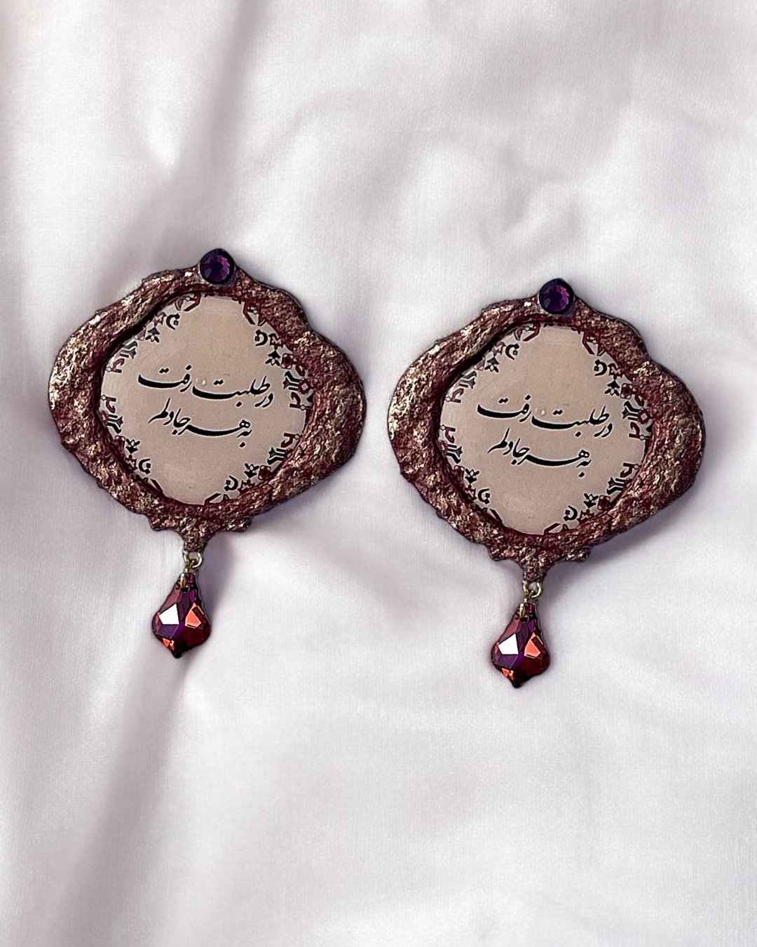 Handcrafted from paper mache,Elegant earrings featuring Persian poetry and premium crystals — a soulful blend of verse, beauty, and craftsmanship.