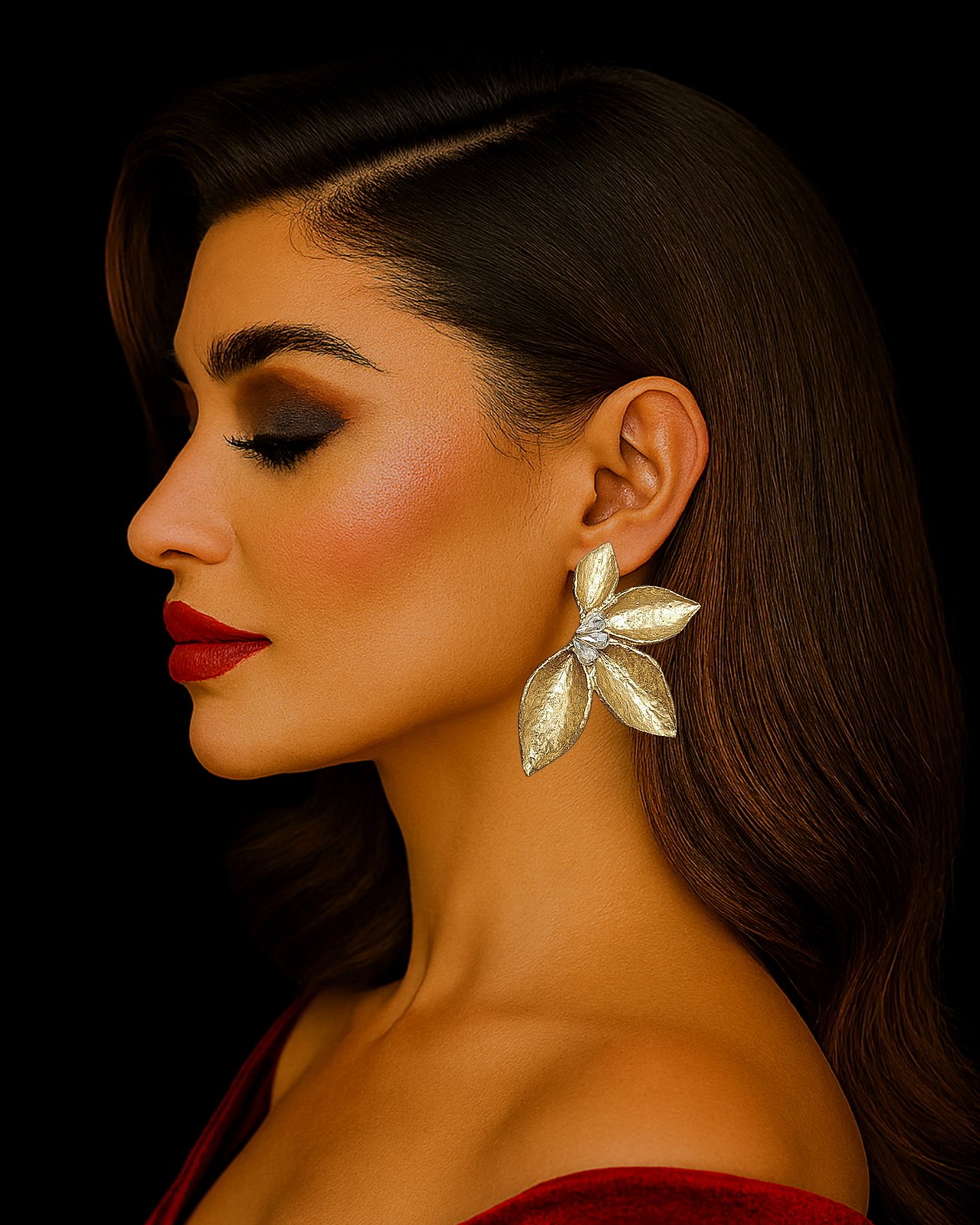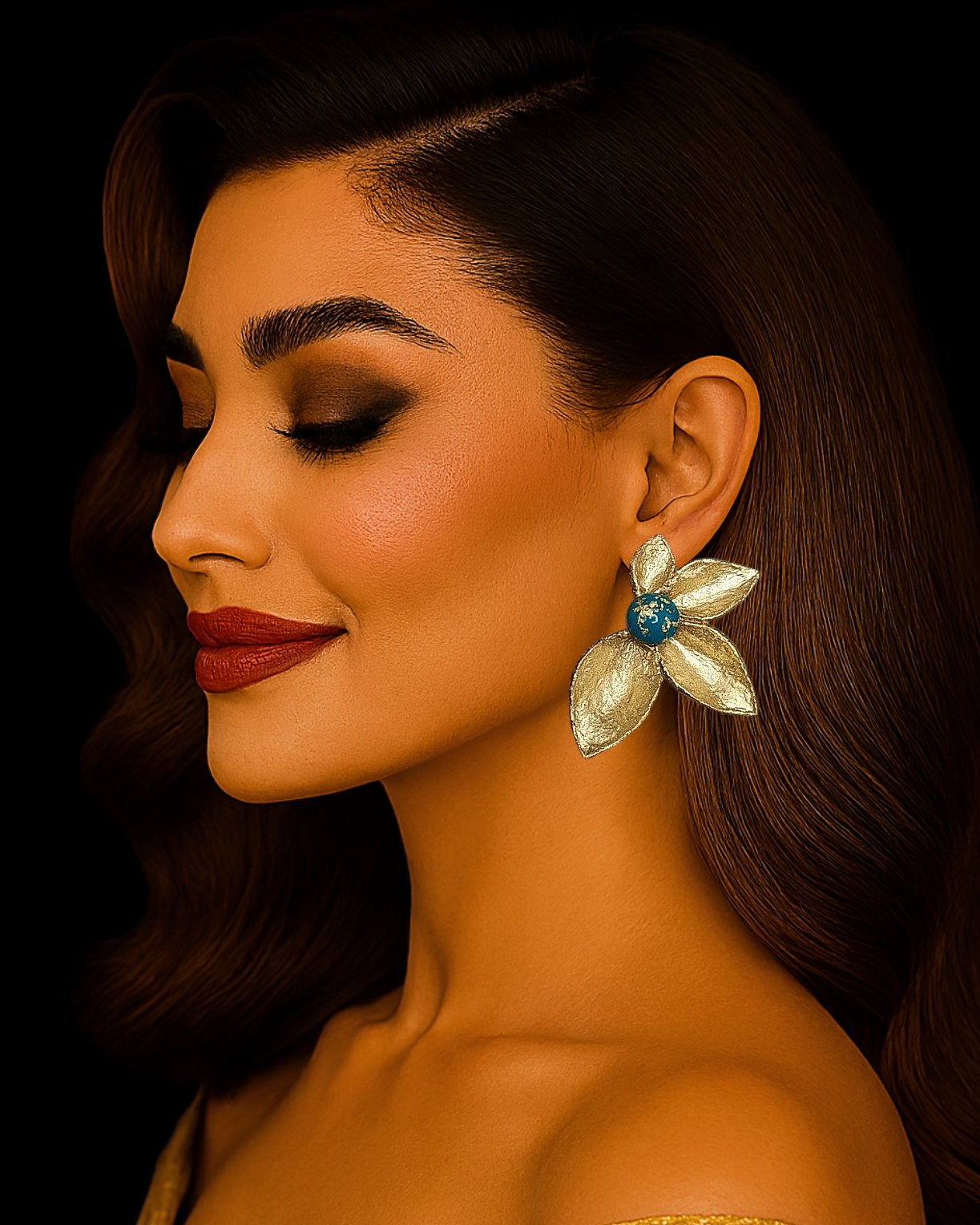 Inspired by the serene beauty of the lotus flower, these handcrafted earrings are a poetic fusion of nature and artistry. Each piece is sculpted from ultra-light papier-mâché, making them effortlessly wearable throughout the day. The symmetrical gold-toned petals evoke a sense of balance and grace, while the center stone—available in two distinct styles—adds a striking focal point: choose between a shimmering handmade resin bead flecked with gold or a luminous crystal that catches the light with every movement. Designed for those who seek meaning in every detail, these earrings are more than accessories—they’re wearable stories. Whether you’re styling for a gallery opening, a poetic photoshoot, or simply elevating your everyday look, the Lotus Bloom Earrings offer a unique blend of elegance and symbolism. Their lightweight construction ensures comfort, while the dual stone options allow for personal expression. Perfect for fashion lovers, artists, and dreamers alike, these earrings are a tribute to transformation, beauty, and the quiet power of nature.