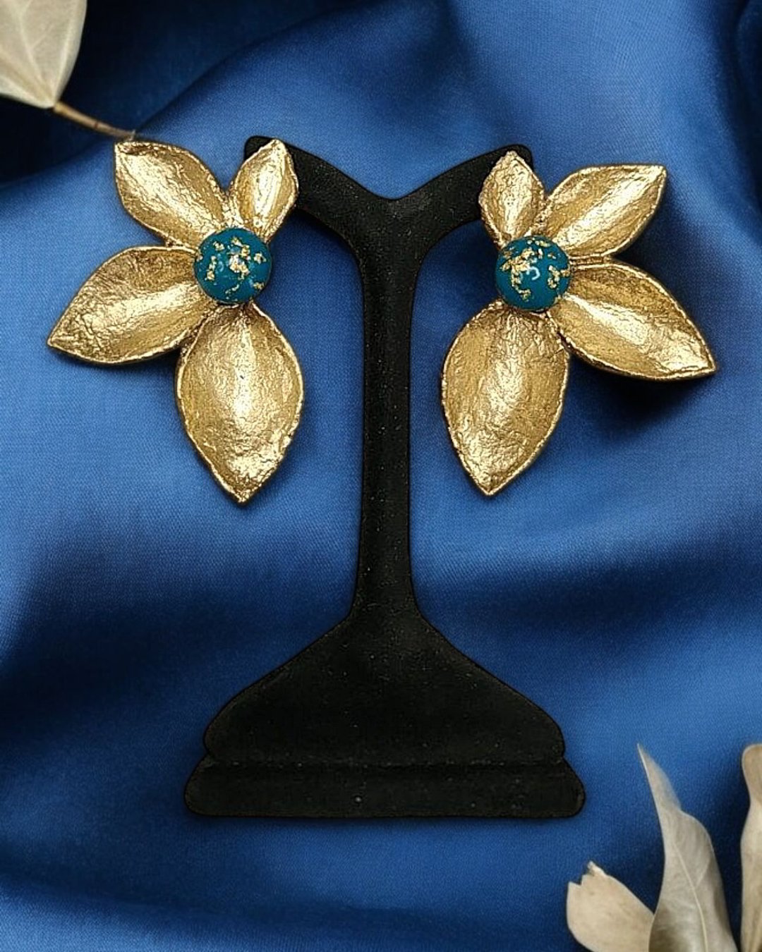 Lightweight papier-mâché earrings inspired by lotus flowers, featuring handmade resin or crystal stones. Elegant, artistic, and feather-light.