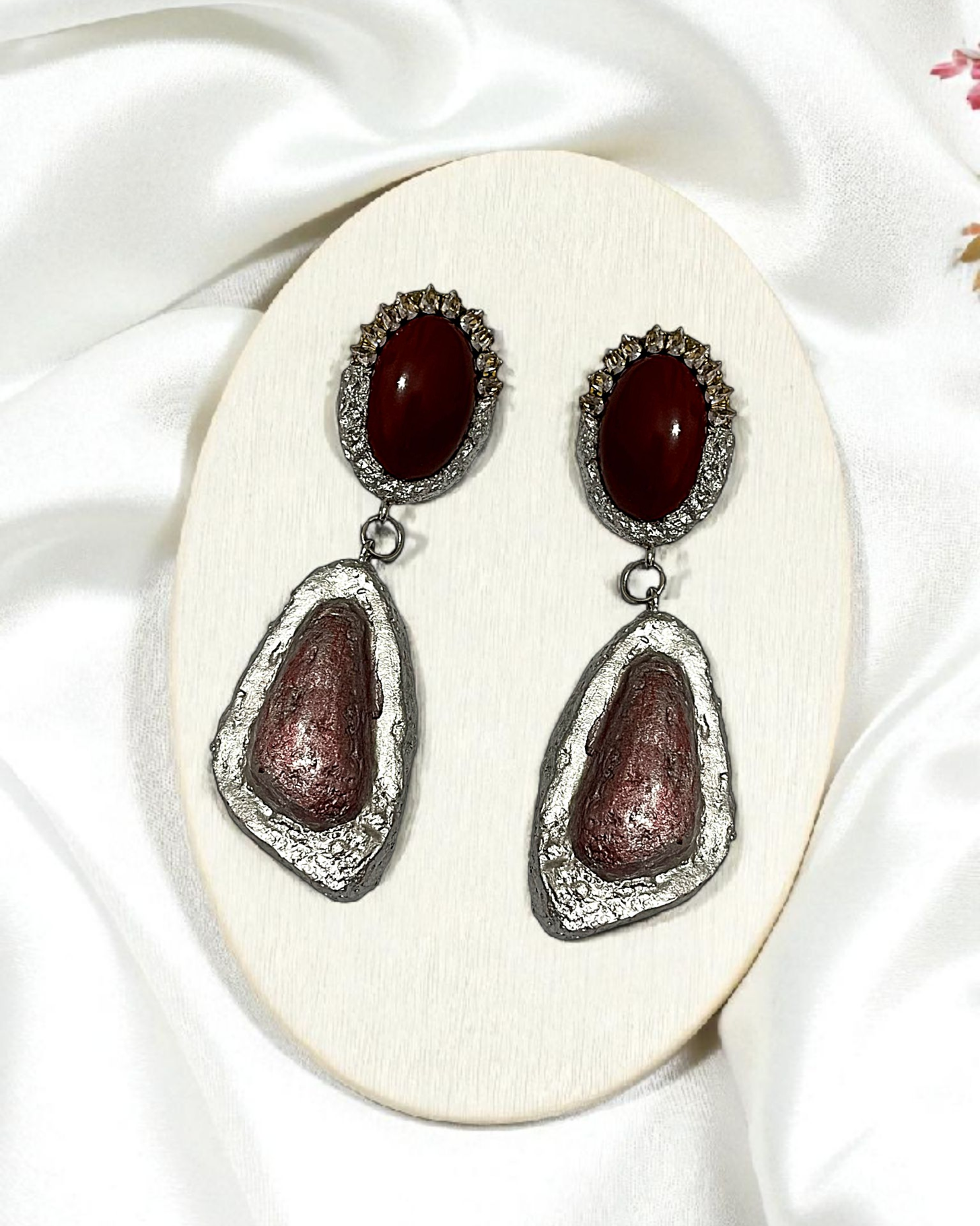 Discover the poetic elegance of Lover’s Stone Earrings—a captivating fusion of Handmade Jewel and sculptural artistry. These statement pieces combine the delicacy of papier-mâché with the strength of emotional storytelling. Each earring is featherlight yet visually bold, hand-painted with liquid silver leaf to evoke the shimmer of moonlit minerals. The top features a deep crimson resin gem, surrounded by glistening accents, while the lower pendant mimics the raw texture of natural stone, echoing the heartbeat of the earth.  Designed for those who wear emotion as adornment, these earrings celebrate the union of fragility and passion. The handcrafted resin stones symbolize love’s intensity, while the irregular, rock-like forms speak to its unpredictable beauty. Whether paired with minimalist fashion or layered into a maximalist look, Lover’s Stone becomes a wearable poem—an ode to the soul’s longing, crafted with care and intention. Ideal for artists, romantics, and collectors of symbolic design, this pair invites you to carry a piece of your story wherever you go.