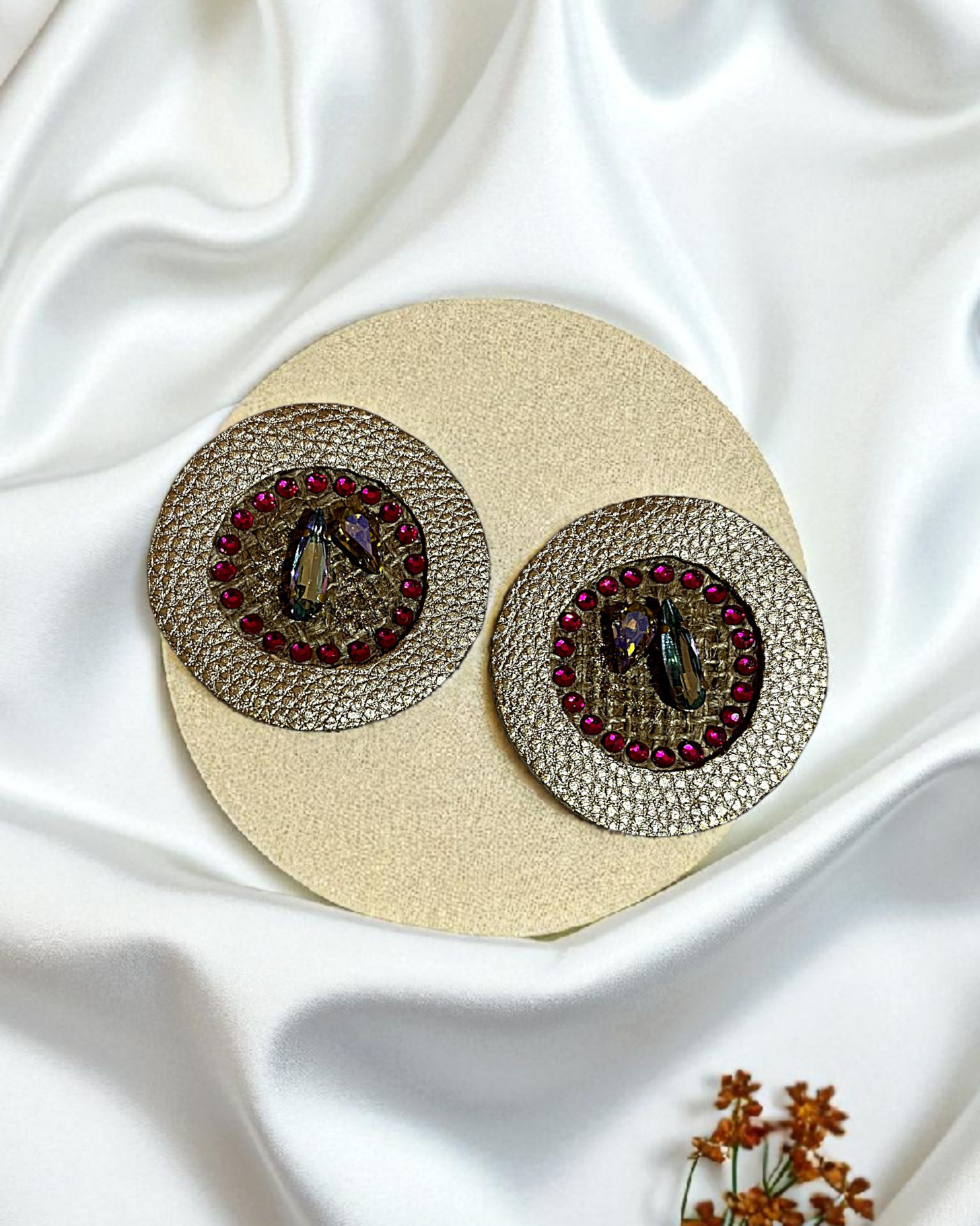 Lightweight circular earrings crafted from faux leather and adorned with radiant crystals. A bold yet elegant statement for any occasion.