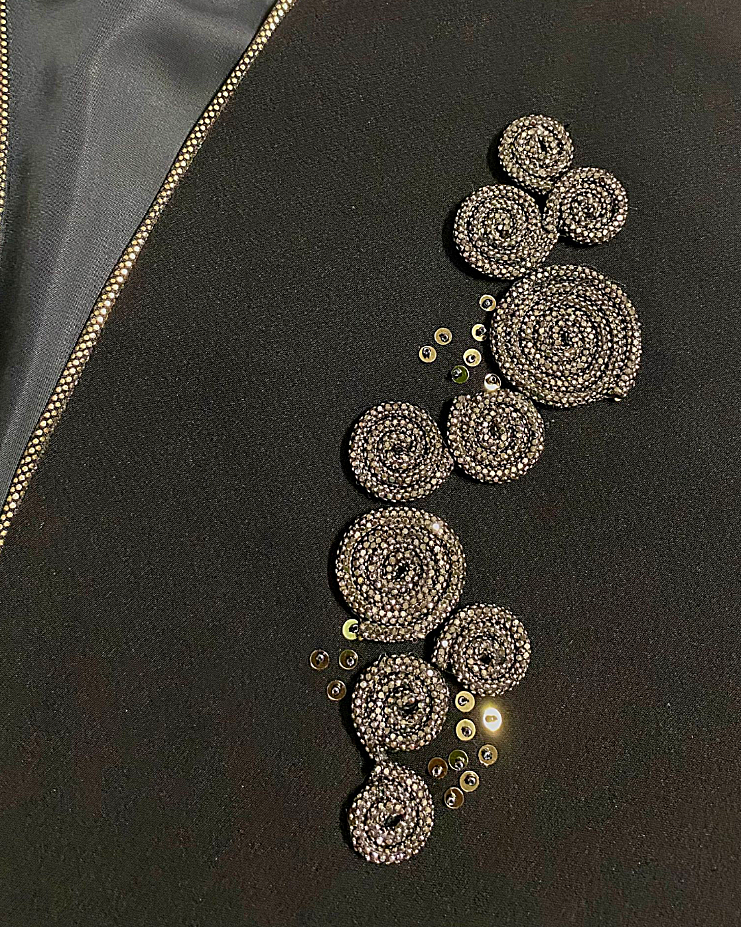 Step into timeless elegance with the Midnight Spiral—a black luxury vest designed to evoke mystery, refinement, and emotional resonance. Crafted with a rich satin lining and tailored to a flattering 65 cm length, this piece blends classic silhouette with symbolic embellishment. The vest’s edges are finished with velvet piping, adding a tactile contrast that frames the garment with precision and grace. The right panel features a captivating spiral motif, adorned with shimmering gemstones and intricate embroidery. These embellishments are more than decorative—they echo themes of continuity, transformation, and inner strength. Whether styled for formal occasions or layered into a fashion-forward ensemble, this vest becomes a statement of identity and artistry. Designed for those who value detail, symbolism, and poetic presentation, Midnight Spiral is more than fashion—it’s a narrative you wear.