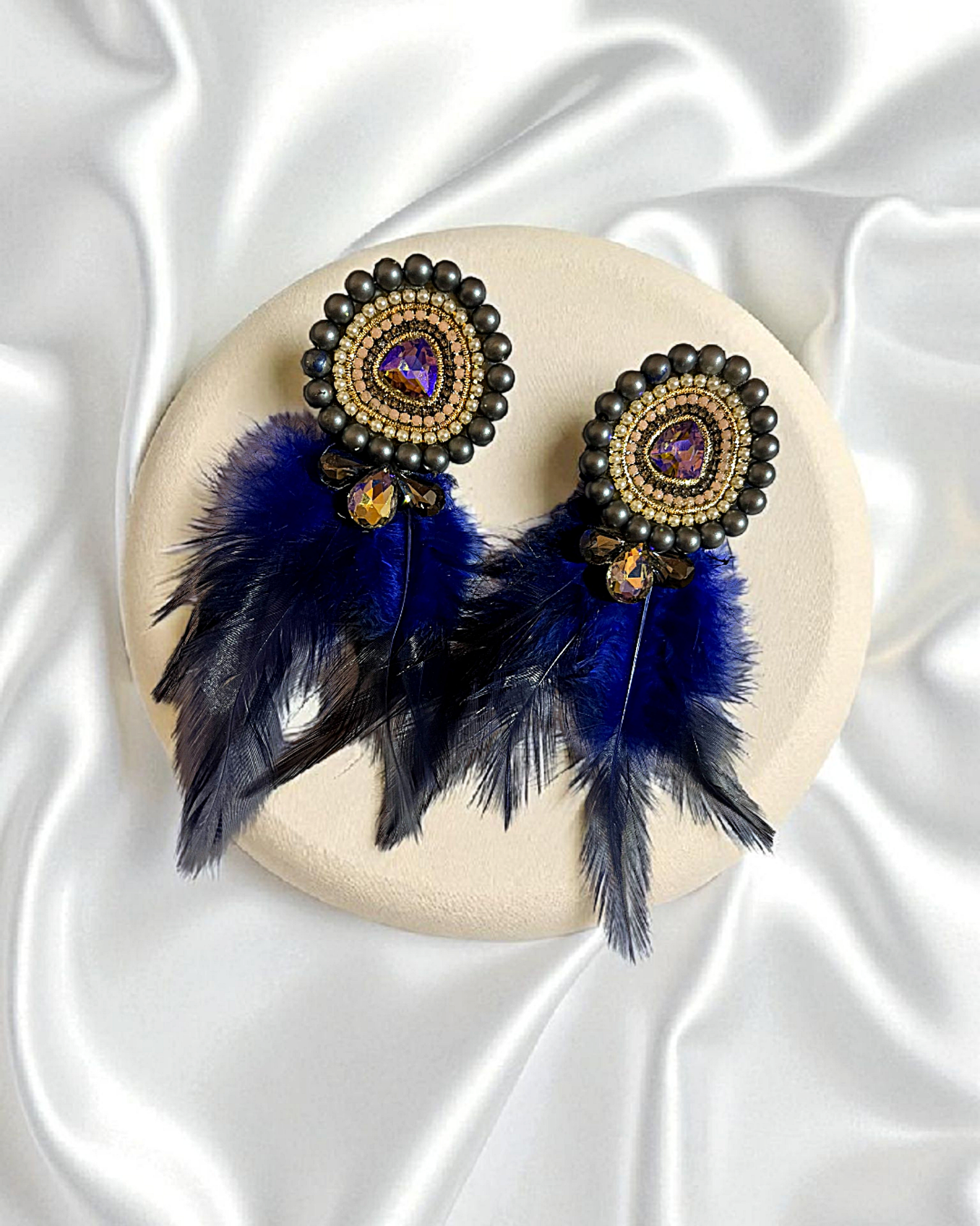 Embrace elegance with handcrafted Night Peacock earrings, featuring intricate bead embroidery and a design inspired by midnight glamour.