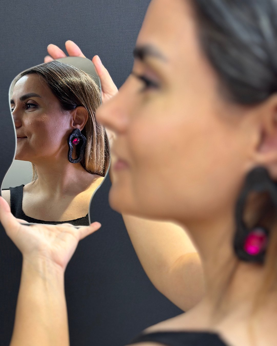 Ordibehesht handmade earrings Papier-Mache with fuchsia stone with Fuchsia Stone are exquisite accessories that combine artisanal craftsmanship with modern elegance. Each pair is meticulously handcrafted from durable, lightweight papier-mâché, ensuring comfortable all-day wear while maintaining a striking, artistic look.