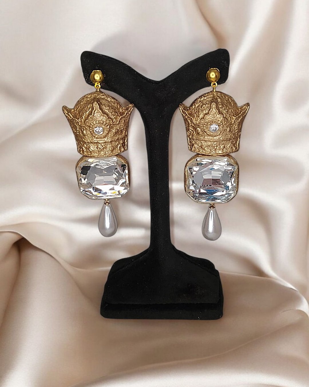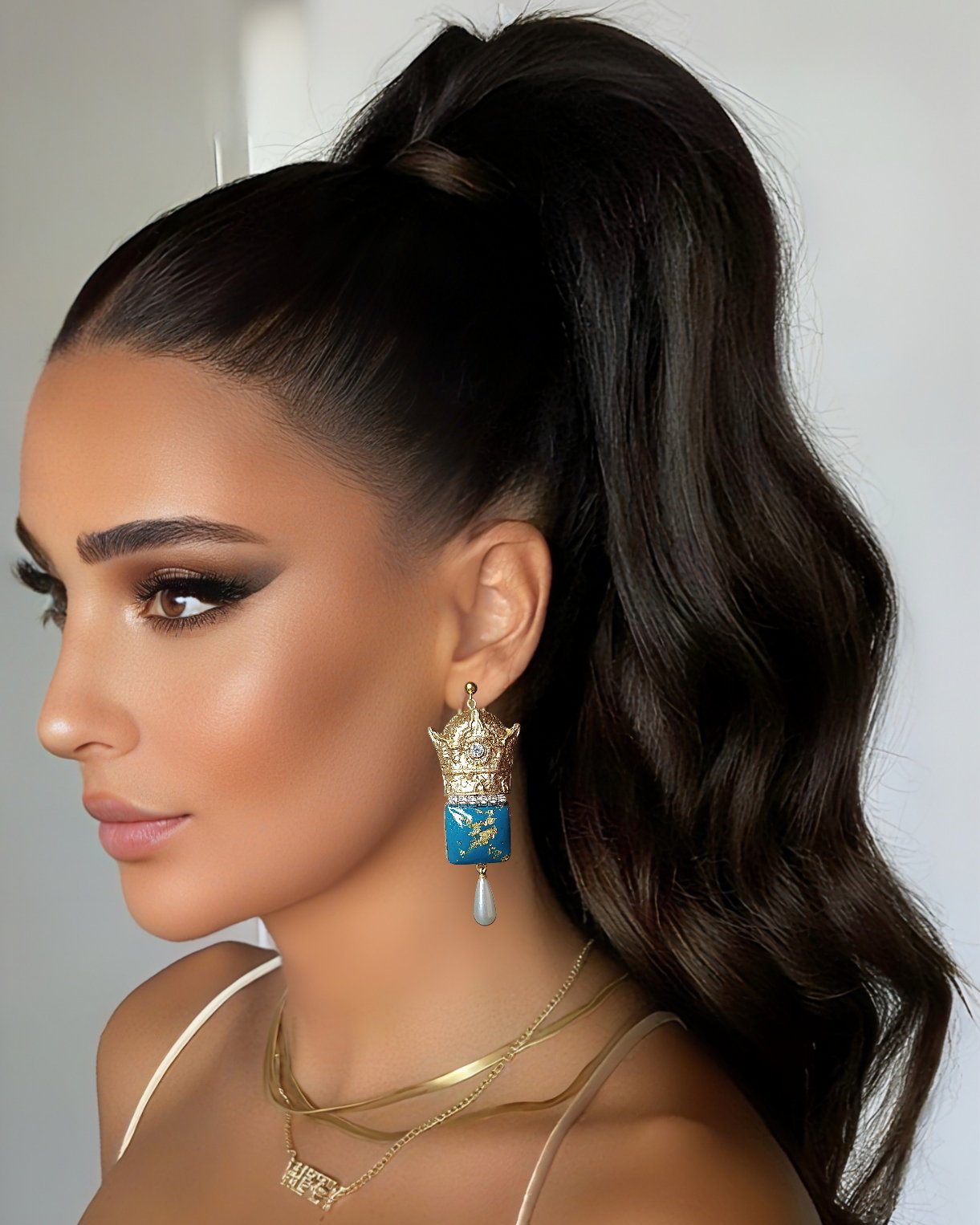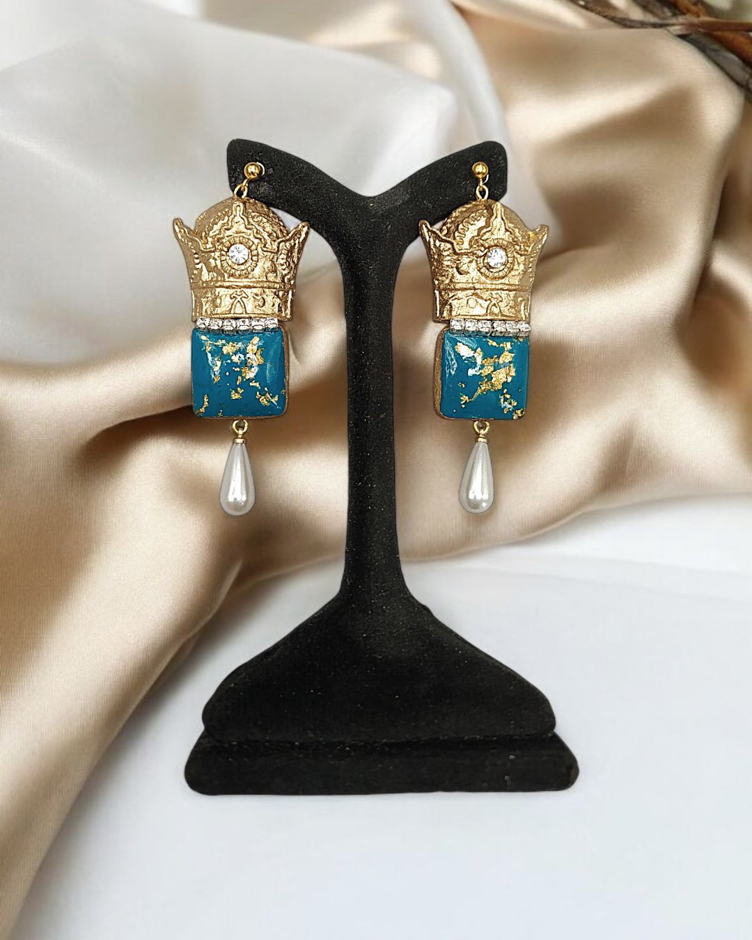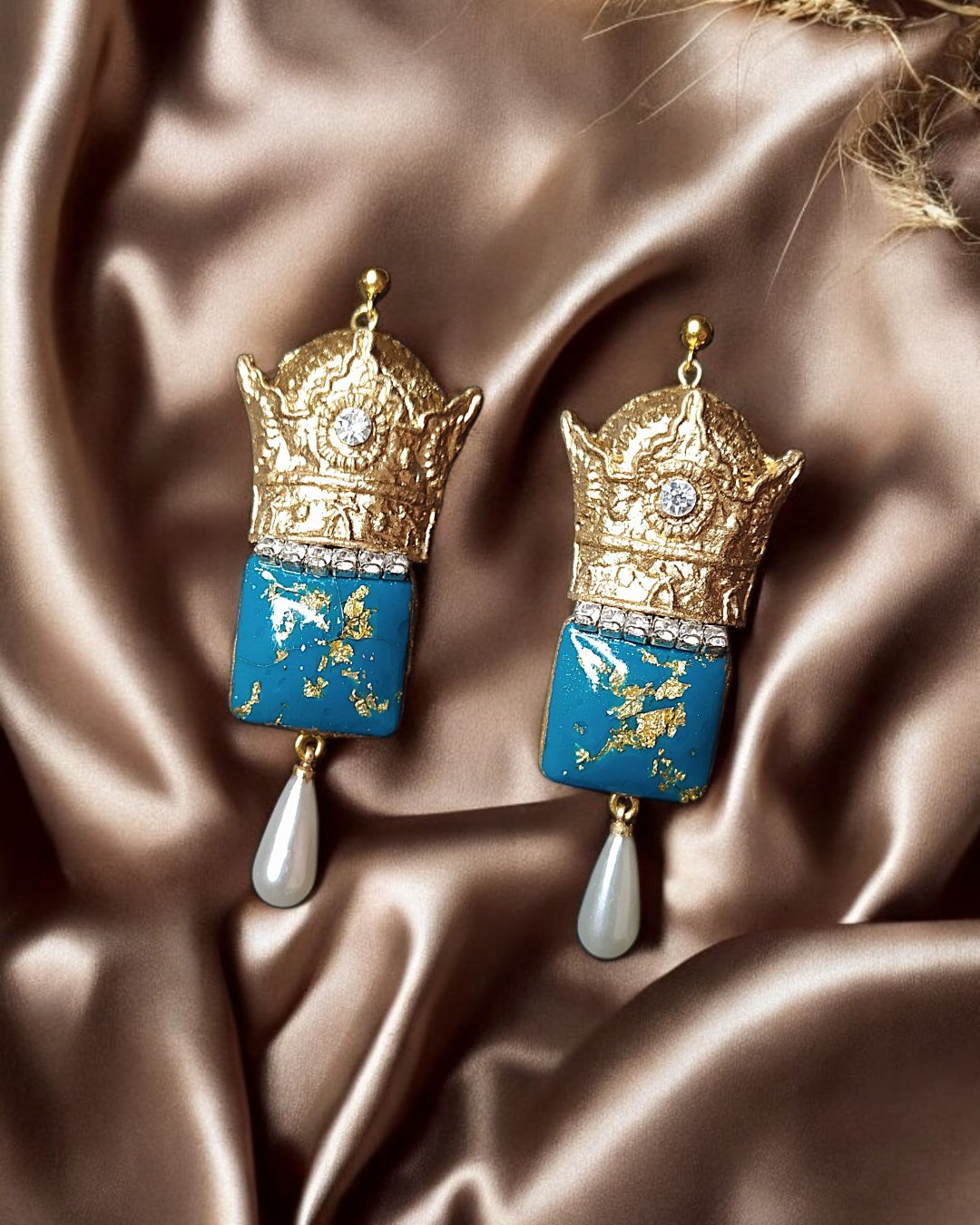 Step into a world of regal elegance with these handcrafted earrings, where artistry meets symbolism. Each piece is sculpted from ultra-light papier-mâché, ensuring effortless wear throughout the day. The crown-shaped top, gilded with shimmering gold powder, evokes royalty and timeless grace. Embedded crystal stones catch the light with every movement, adding a subtle sparkle that complements the richness of the design. Beneath the crown, a square turquoise resin segment flecked with gold offers a vibrant contrast—hand-poured and polished to perfection. The final touch: a teardrop-shaped pearl-like pendant that sways gently, echoing softness and femininity. These earrings are not just accessories—they’re miniature sculptures that tell a story of craftsmanship, emotion, and poetic beauty. Ideal for statement styling, editorial shoots, or elevating everyday looks, they embody the fusion of tradition and innovation in wearable art.