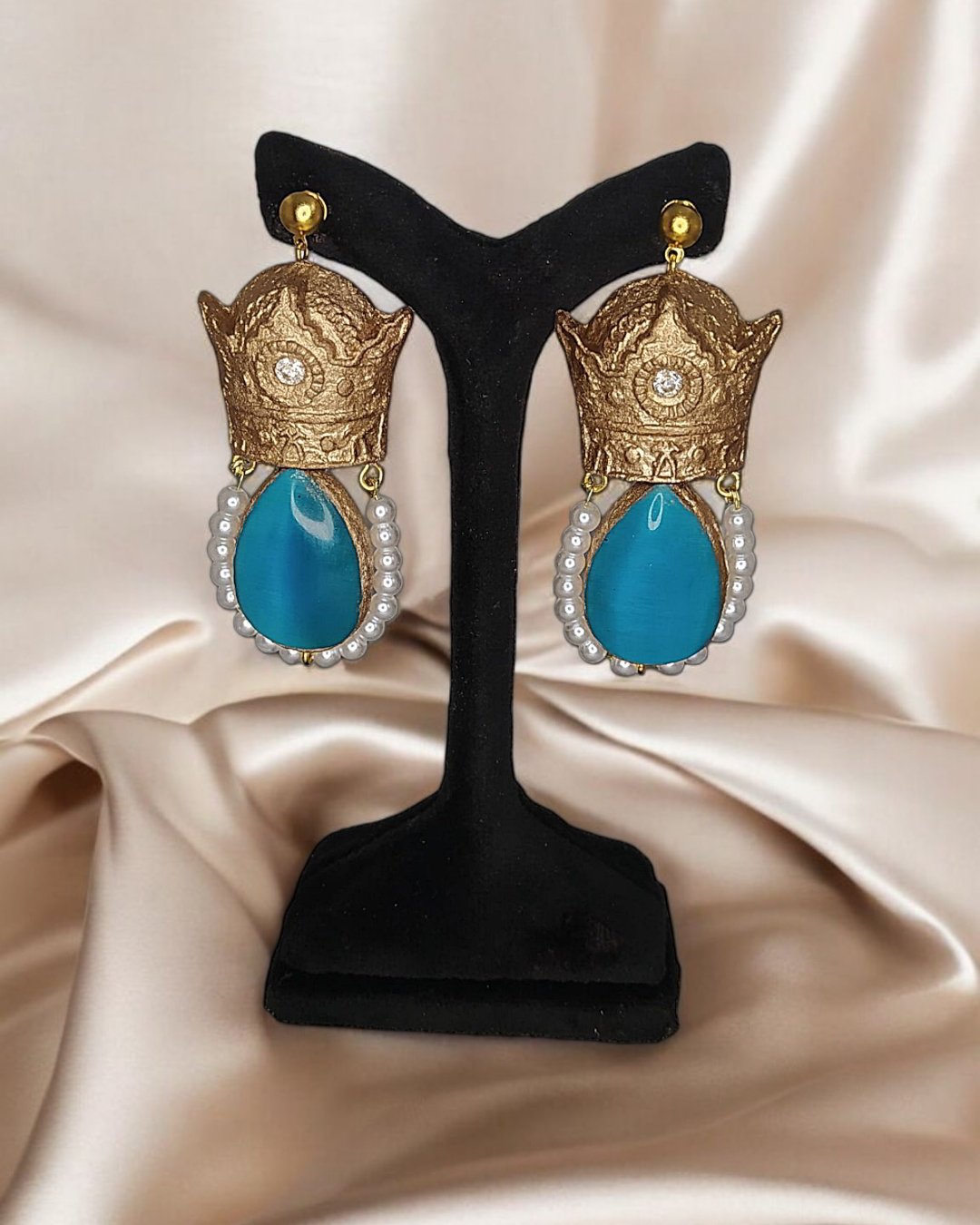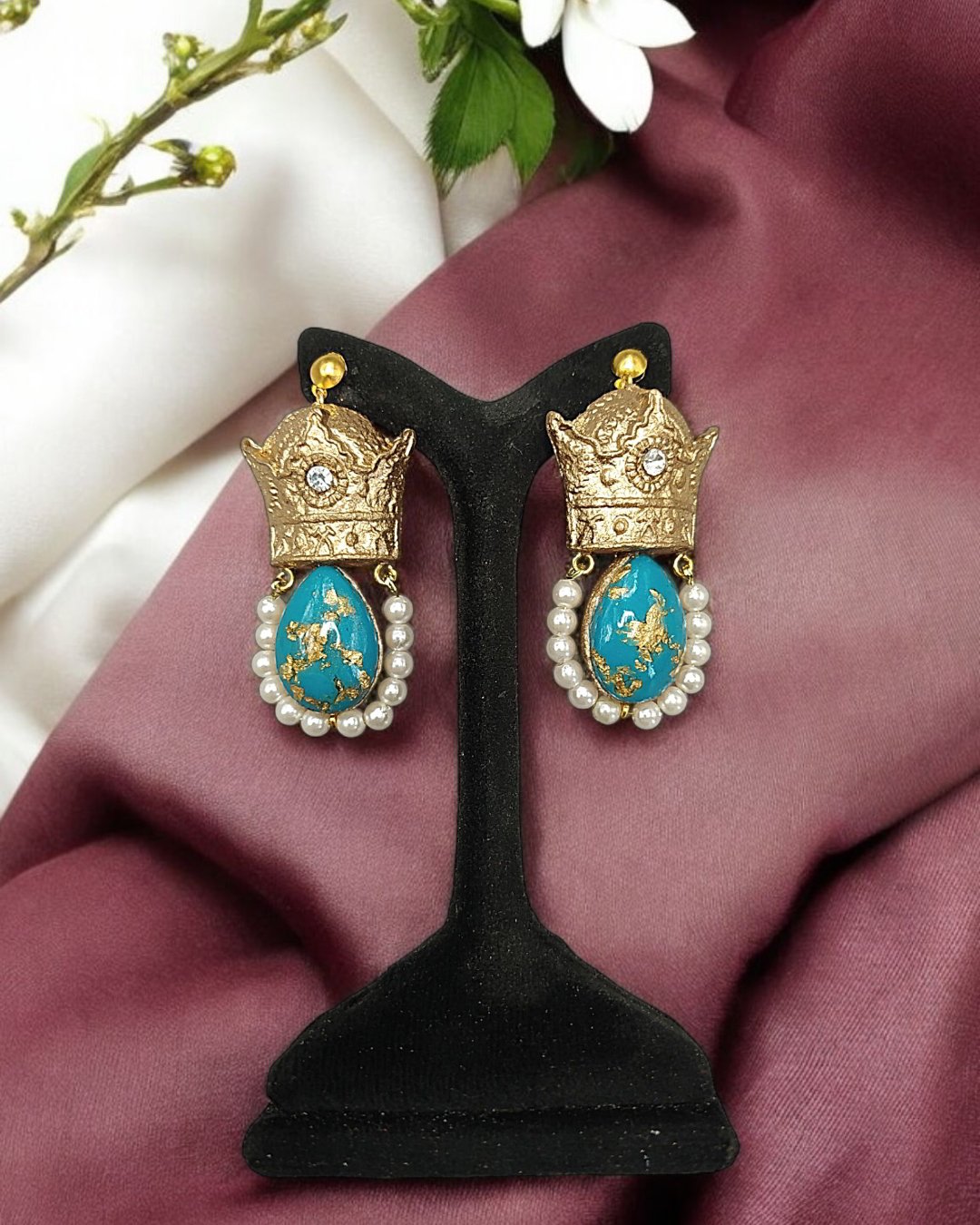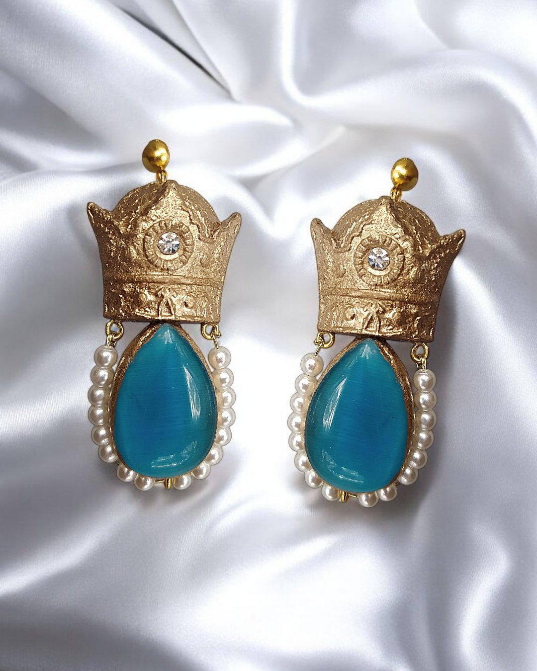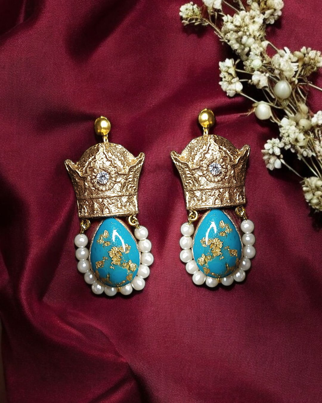 Step into a world of handcrafted elegance with these regal teardrop earrings, meticulously designed using lightweight papier-mâché and hand-poured resin stones. Each piece is crowned with a textured gold top, set with a shimmering crystal, and adorned with a turquoise teardrop embellished in delicate gold leaf. A semicircle of luminous pearls completes the design, adding softness and grace to the bold silhouette.