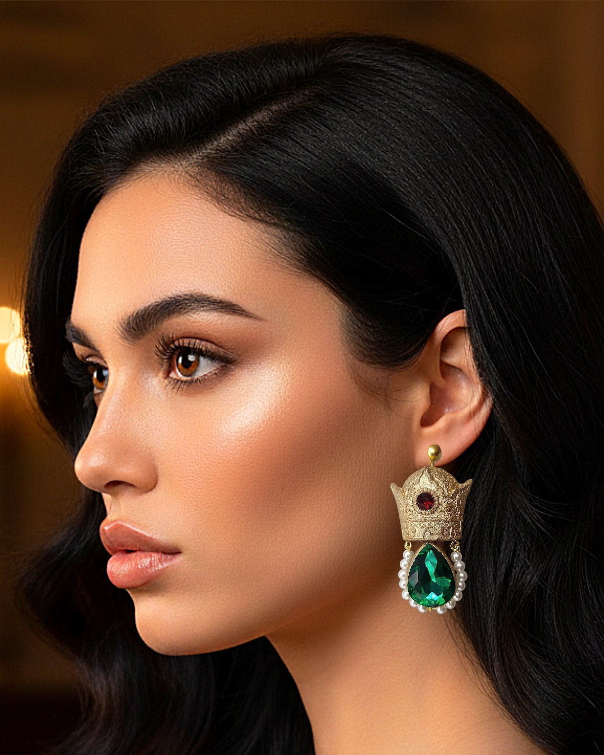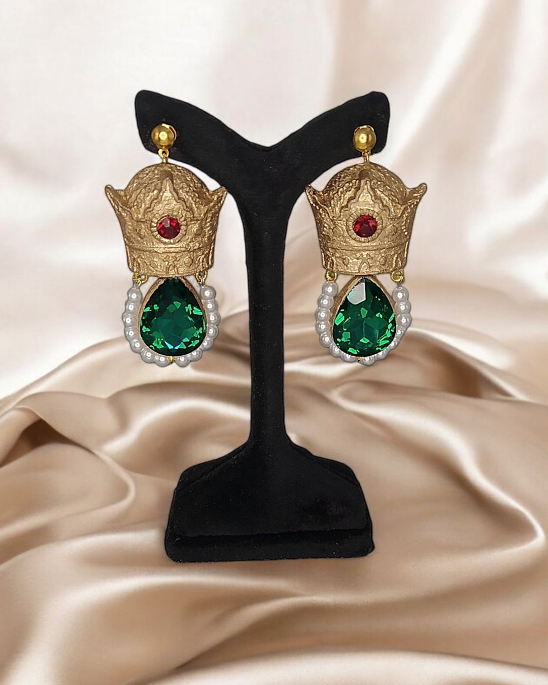 Lightweight handmade earrings crafted from papier-mâché, resin gems, and crystals. Gold-painted with pearl accents for a royal, timeless look.