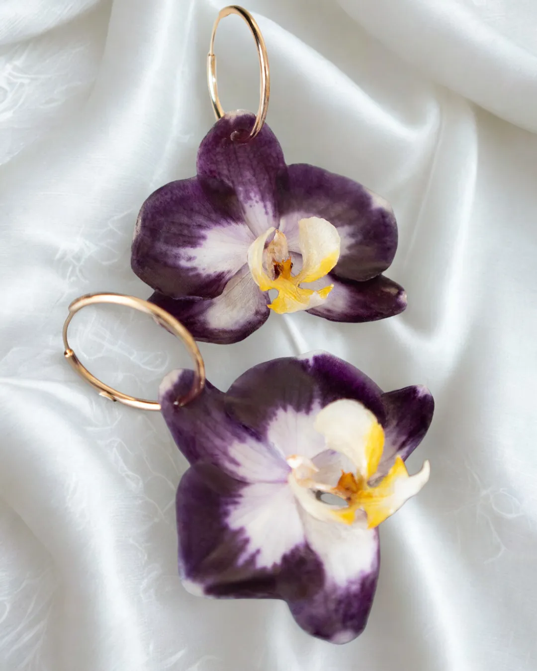 These purple and white Phalaenopsis earrings with their natural yellow crown are not ordinary florals.