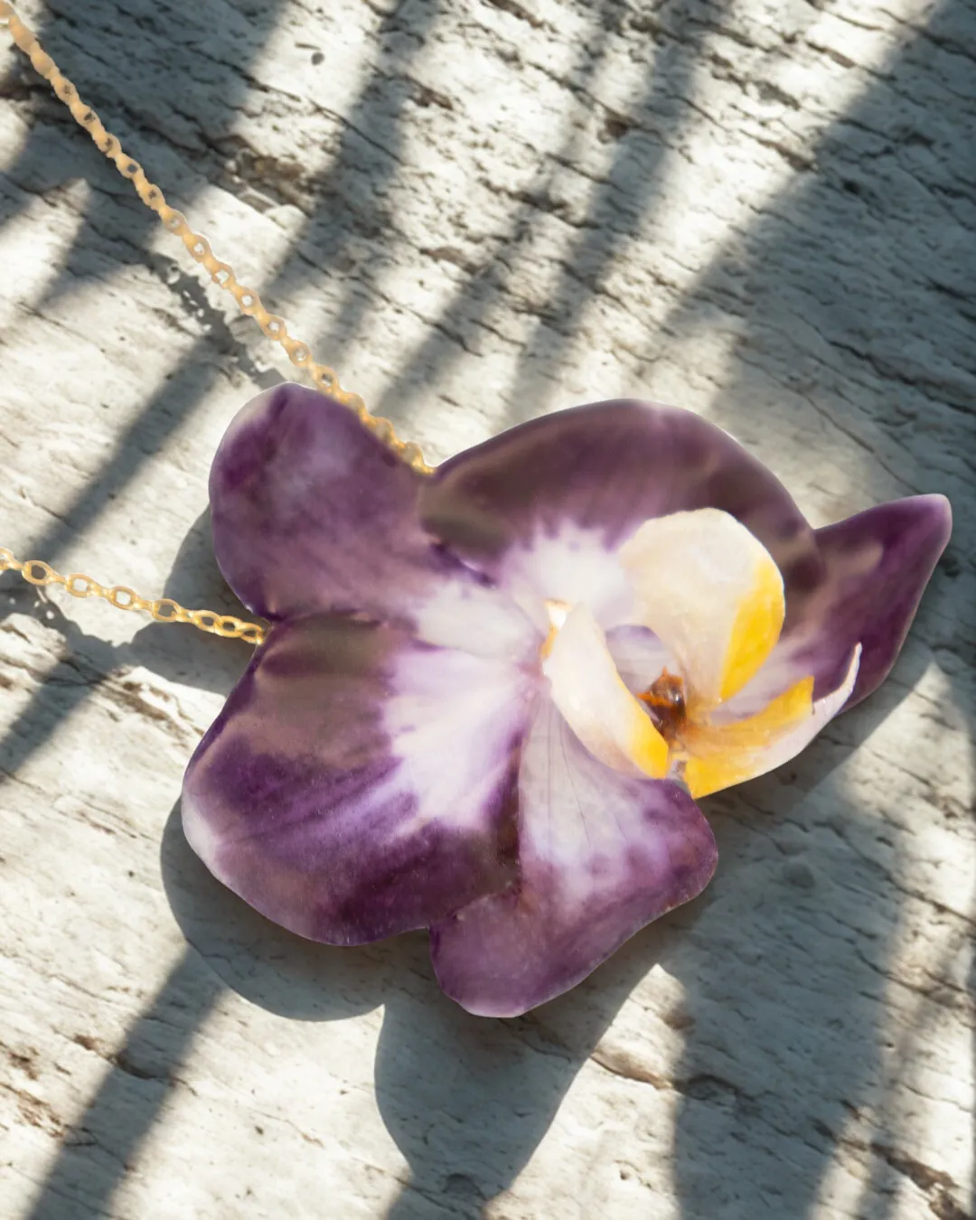 Real purple and white Phalaenopsis orchid with natural yellow crown on gold stainless steel adjustable chain, elegant statement piece perfect for wedding, date use and refined daily use.