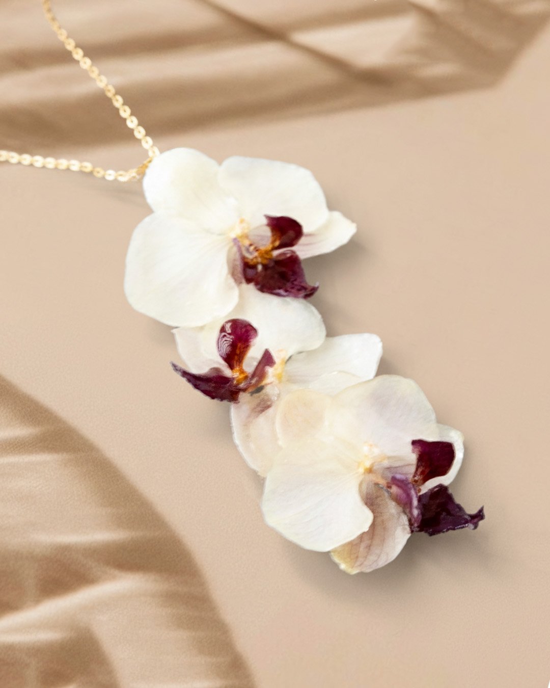 The chain is made of gold-toned stainless steel — chosen for its strength and durability. Beauty should not be fleeting. Like the orchid itself, this necklace is built to last. It’s not only about adornment, but about meaning — strength that holds softness, elegance that carries depth.