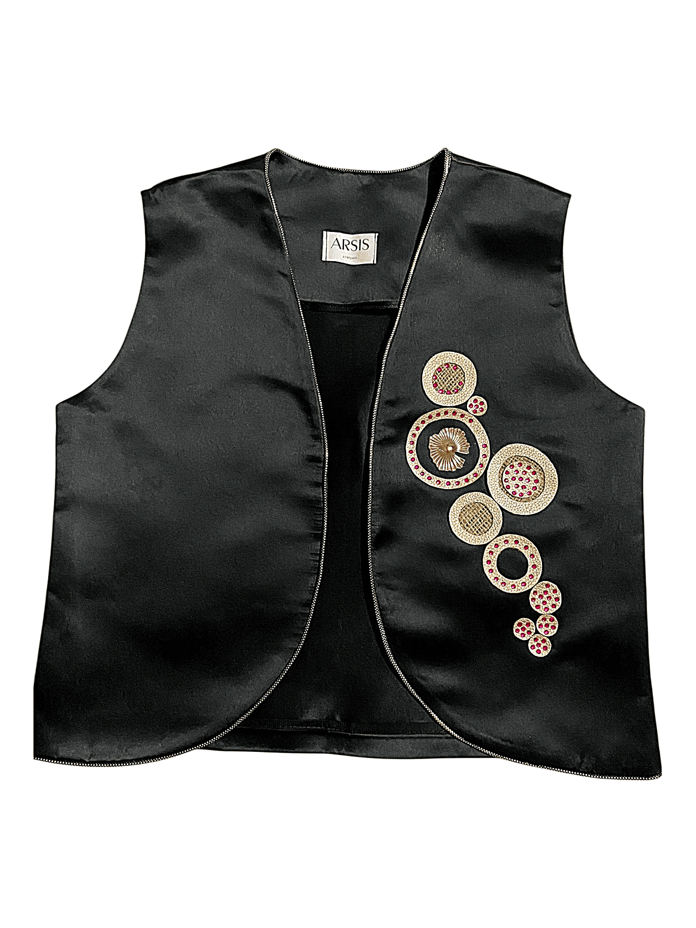 Step into a world of refined symbolism with the Rose Gold Halo Vest In Black Satin Elegance, a sleeveless masterpiece crafted from premium American black satin. This 65cm-long vest is a poetic fusion of celestial geometry and artisanal detail. Its right panel features a vertical constellation of embroidered rose gold rings—each one unique, each one echoing the rhythm of nature and emotion. The edges are meticulously finished with corded piping, adding structure and grace to the silhouette. What sets this piece apart is its tactile storytelling: leather inlays, hand-set rhinestones, and bespoke materials come together to create a visual symphony that feels both grounded and ethereal. Whether styled over a minimalist blouse or layered with bold accessories, this vest becomes a statement of identity and intention. Ideal for fashion-forward souls who seek garments that speak in symbols, textures, and timeless elegance.