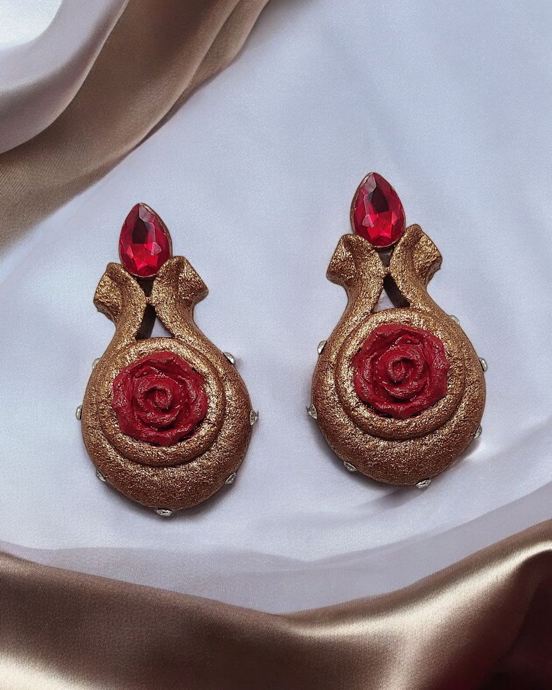 Handcrafted earrings in gold , copper and crimson, featuring roses and crystal tears. Lightweight, water-resistant papier-mâché with mythic elegance.
