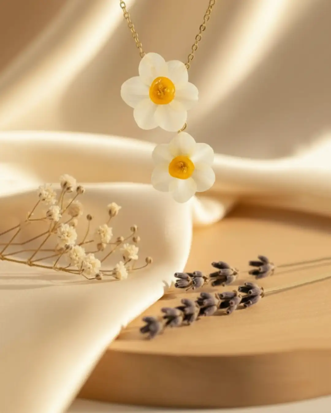 Creating this necklace is a love journey into nature’s soul. Each Narcissus was carefully selected by hand to ensure the finest shape and tenderness, then preserved under layers of crystal-clear resin to maintain its natural beauty without losing its authenticity and simplicity. The resin, like time itself, freezes this perfect moment of nature, you to carry it with you forever.