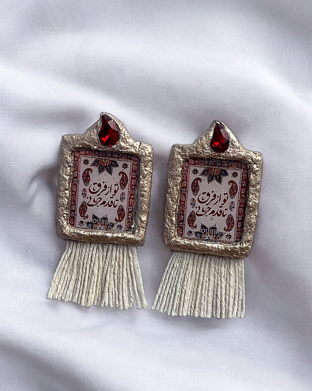 At the top, a shimmering red crystal adds a regal touch, while the bottom mimics the tassels of a traditional carpet — a symbolic gesture toward rootedness and legacy. Painted with gold leaf resin, the earrings glow with warmth and sophistication. Whether worn as a statement of identity or a whisper of poetic sentiment, these earrings invite the wearer to carry soul, story, and style in every step.