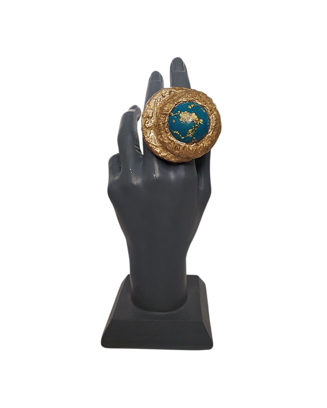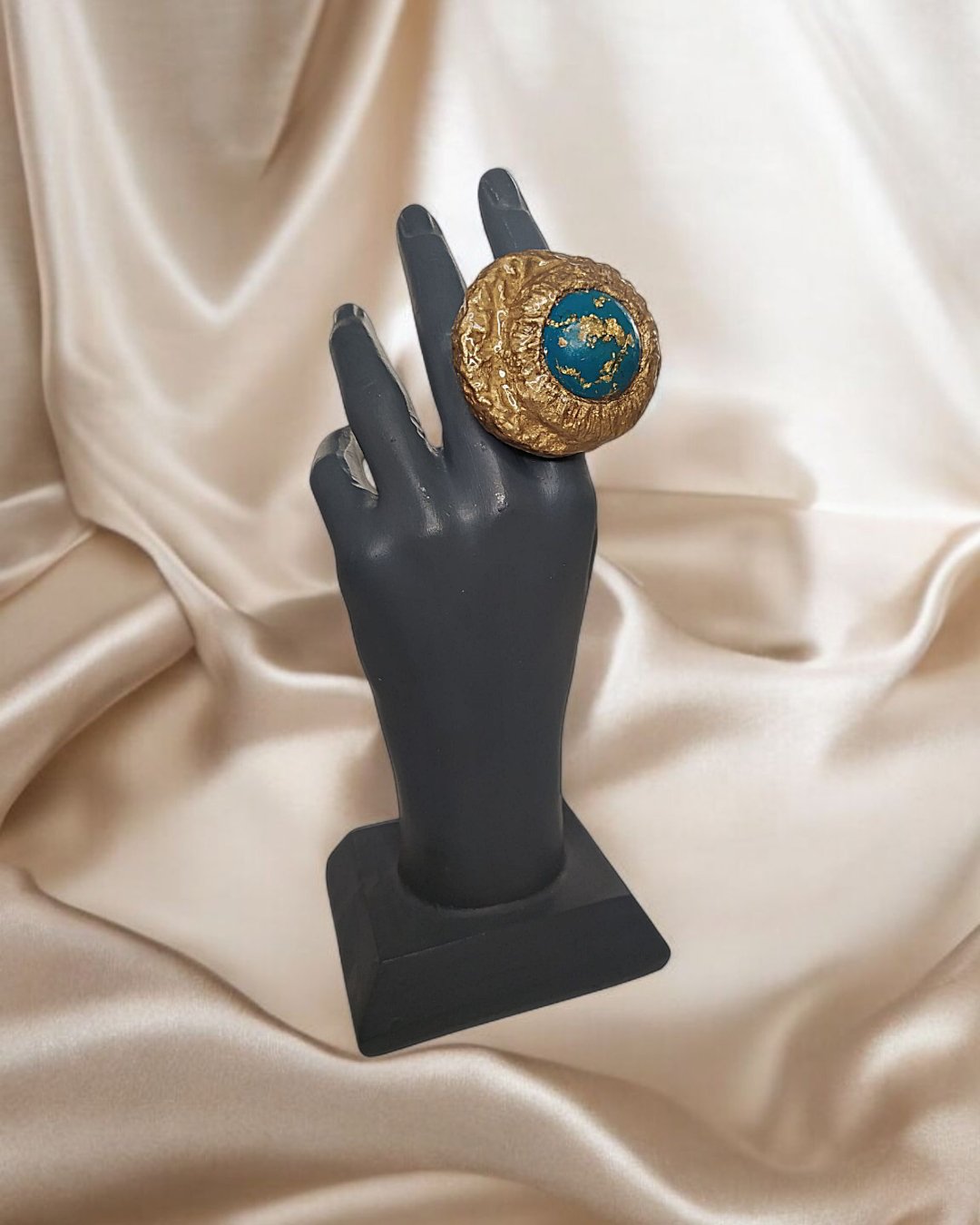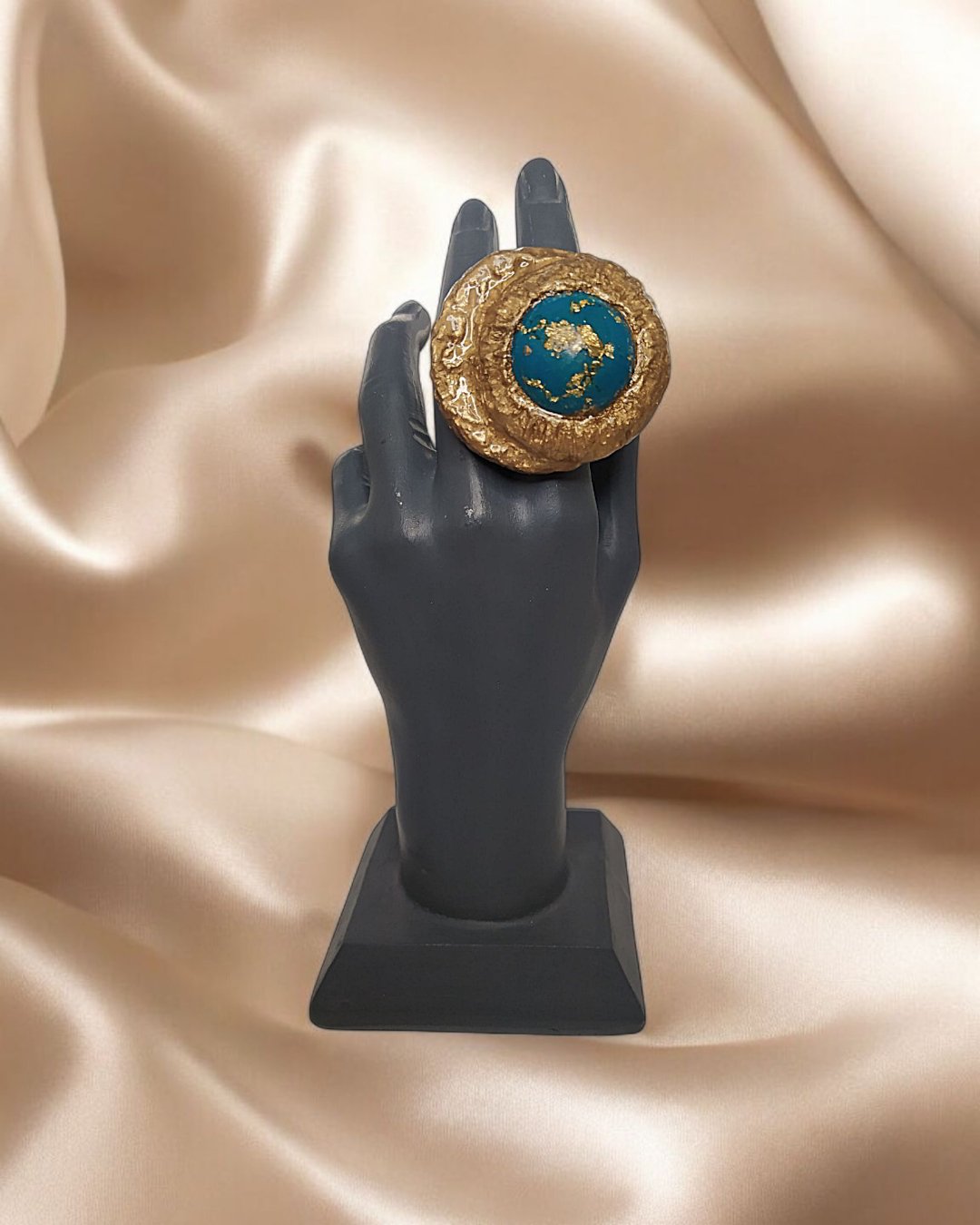 Inspired by celestial harmony, the ring is shaped through the delicate art of papier-mâché, then elevated with shimmering textures and cosmic color. The turquoise-like stone evokes the sky, while the gold leaf mirrors the warmth of the sun. Whether worn as bold fashion accent, this ring speaks to those who seek beauty with meaning. Ideal for lovers of symbolic jewelry, handcrafted design, and poetic storytellin