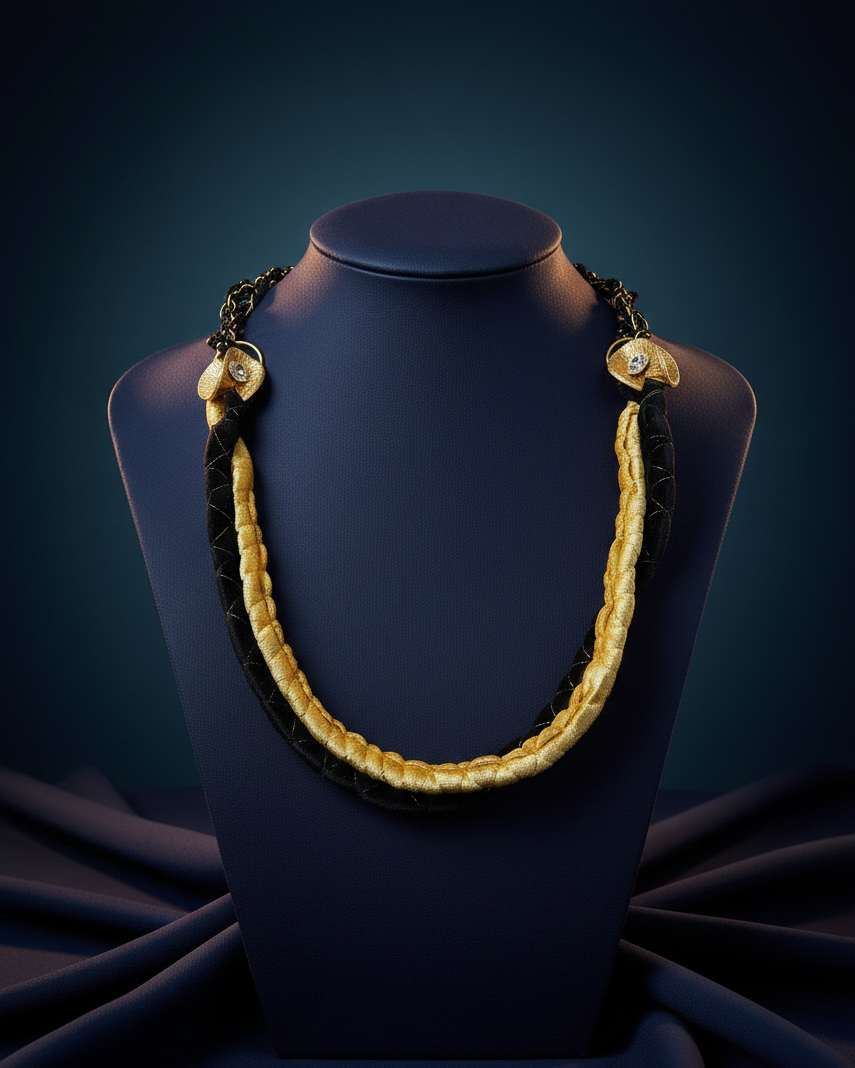The Suntrace Necklace is a mixed‑media artwork brought to life through the fusion of papier‑mâché craftsmanship, intricate crochet detailing, and the soft richness of velvet. Its dual‑tone palette of gold and black creates a striking visual rhythm, capturing the balance between radiance and shadow. Every curve and texture is shaped by hand, giving the piece a sculptural presence that feels both contemporary and deeply artisanal