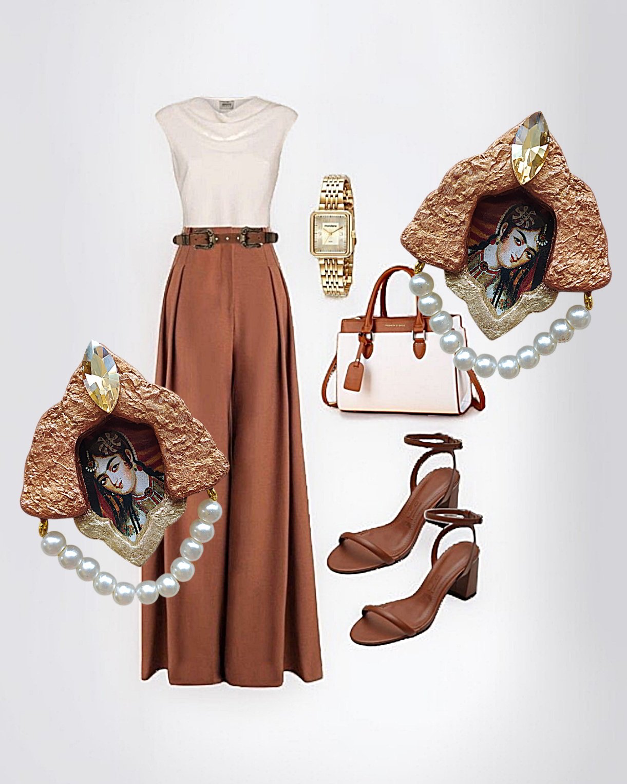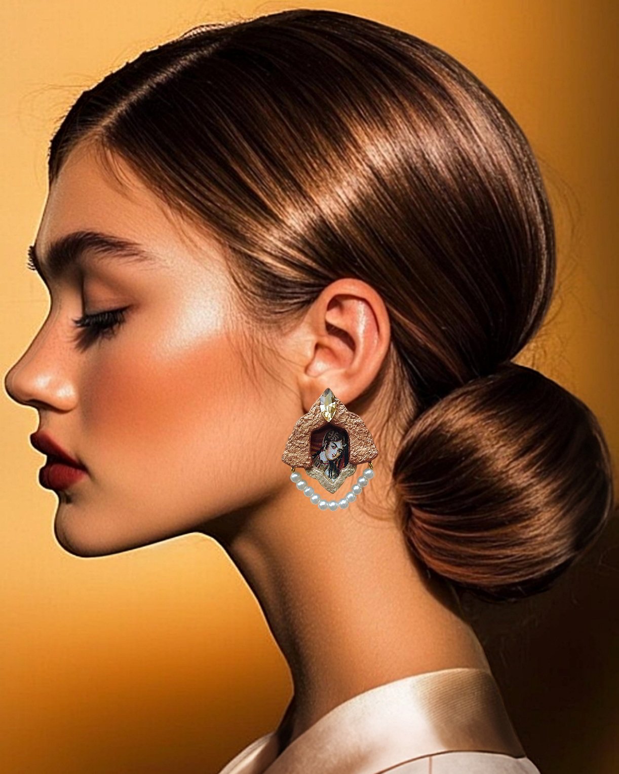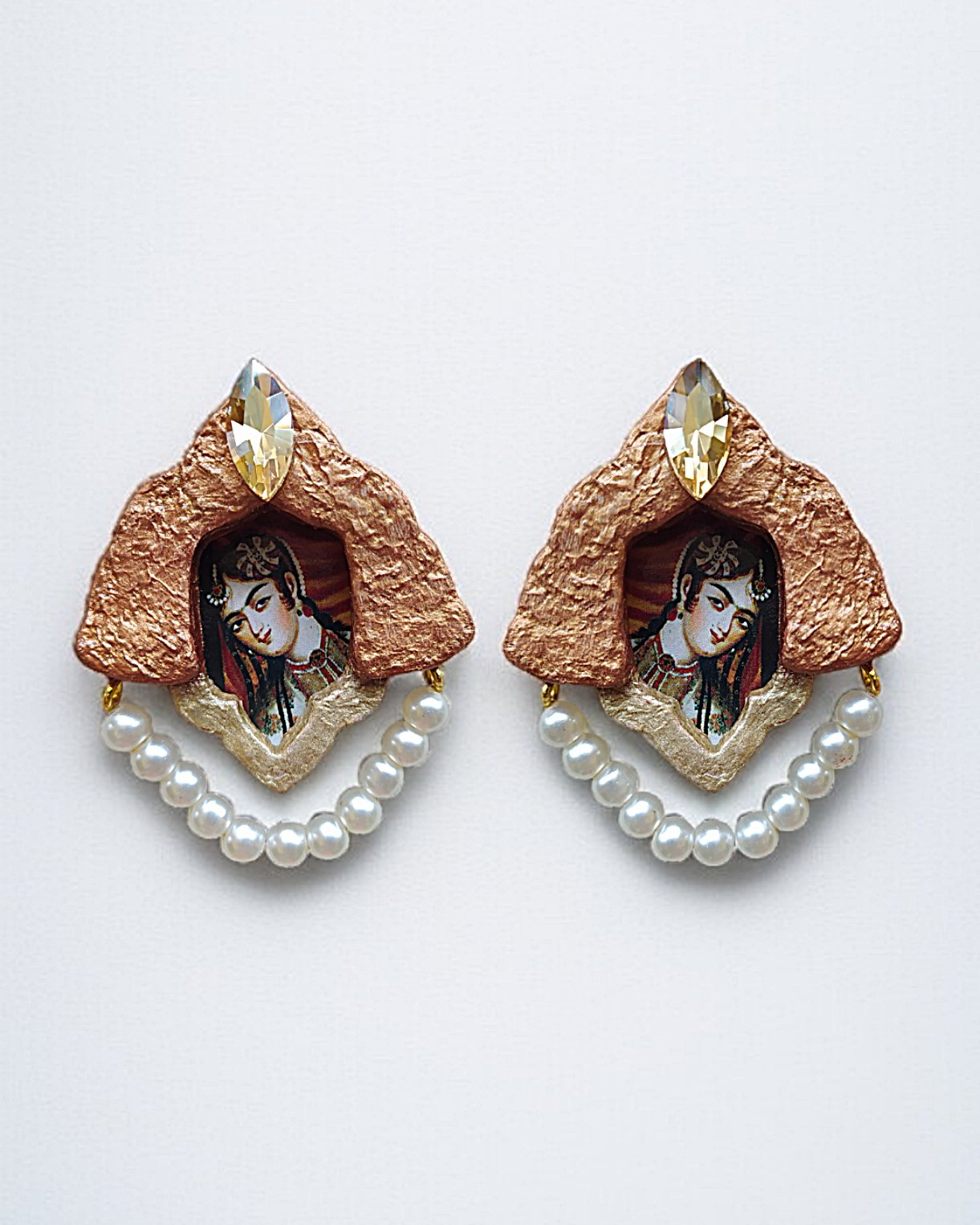 Step into a world where history meets artistry. These handcrafted earrings are a tribute to the elegance of Qajar-era women, captured in miniature portraits that evoke timeless grace. Each piece is made from ultra-light papier-mâché, ensuring comfort without compromising on visual impact. The copper-toned frame, reminiscent of architectural arches or seashells, adds depth and texture, while the teardrop gem above the portrait catches the light with every movement.  Beneath the central image, a delicate crescent of white pearls offers a soft contrast, symbolizing purity and refinement. These earrings are not just accessories—they’re wearable stories. Designed for lovers of vintage aesthetics and poetic symbolism, they blend classical Persian motifs with modern mixed-media craftsmanship. Perfect for editorial shoots, gallery events, or elevating everyday looks, they invite conversation and admiration wherever they go.