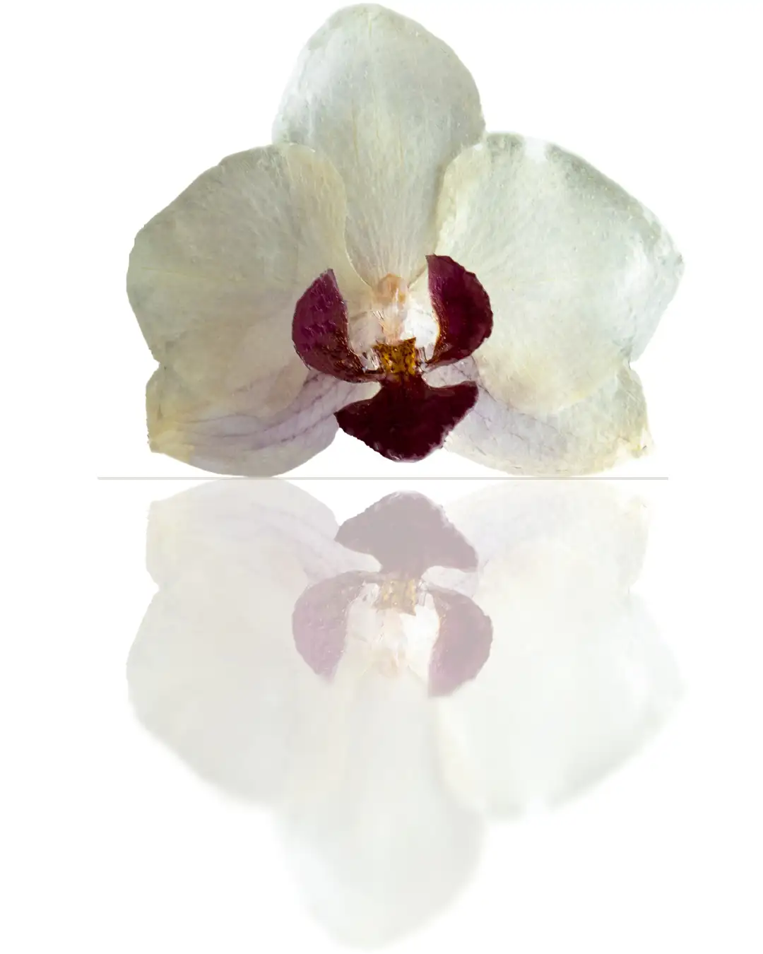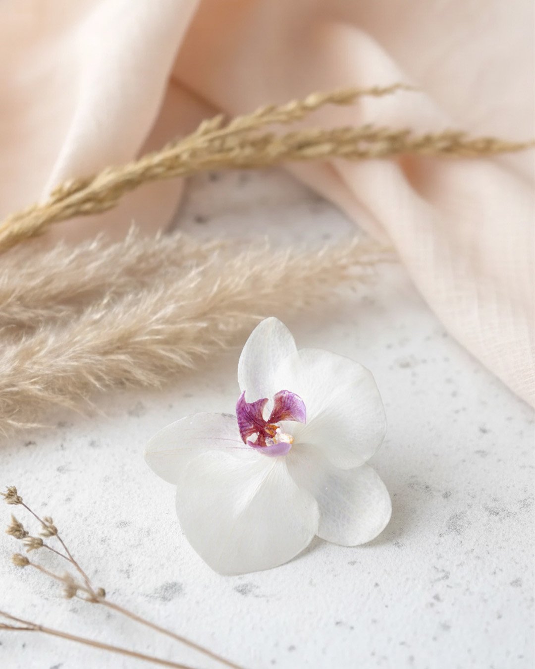When I began creating this brooch, my intention was to preserve the authenticity of the orchid. I did not alter its shape or colors, because I believe that true beauty lies in what is already present in nature. This particular orchid bloom features a soft blend of pale pink and creamy white petals, with a delicate violet-pink center that adds depth and focus. The color palette evokes serenity, tenderness, and sophistication—a combination that subtly draws attention without being loud.