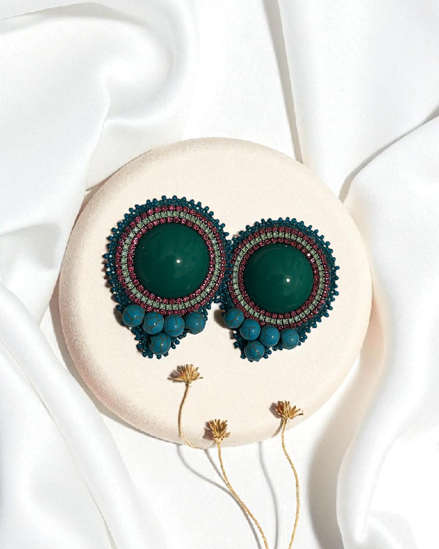 Introducing the Turquoise Blossom Earrings—a celebration of color, craftsmanship, and soulful design. These Turquoise Flower Earrings are meticulously handcrafted using the delicate art of jewelry embroidery, featuring a central turquoise-colored resin stone that’s shaped and polished by hand. Surrounding the stone are concentric rings of pink, silver, and blue beads, arranged with precision to evoke the layered beauty of a blooming flower. The teardrop silhouette is completed with dangling turquoise beads, adding graceful movement and a touch of whimsy to every step. Inspired by nature and emotion, these earrings are more than accessories—they’re wearable poetry. Ideal for those who seek meaning in their style, each piece tells a story of intentional artistry and cultural nuance. Whether paired with flowing fabrics or minimalist outfits, the Turquoise Flower Earrings offer a bold yet tender statement. Perfect for gifting or self-expression, they embody the harmony between tradition and innovation, making them a timeless addition to any jewelry collection.