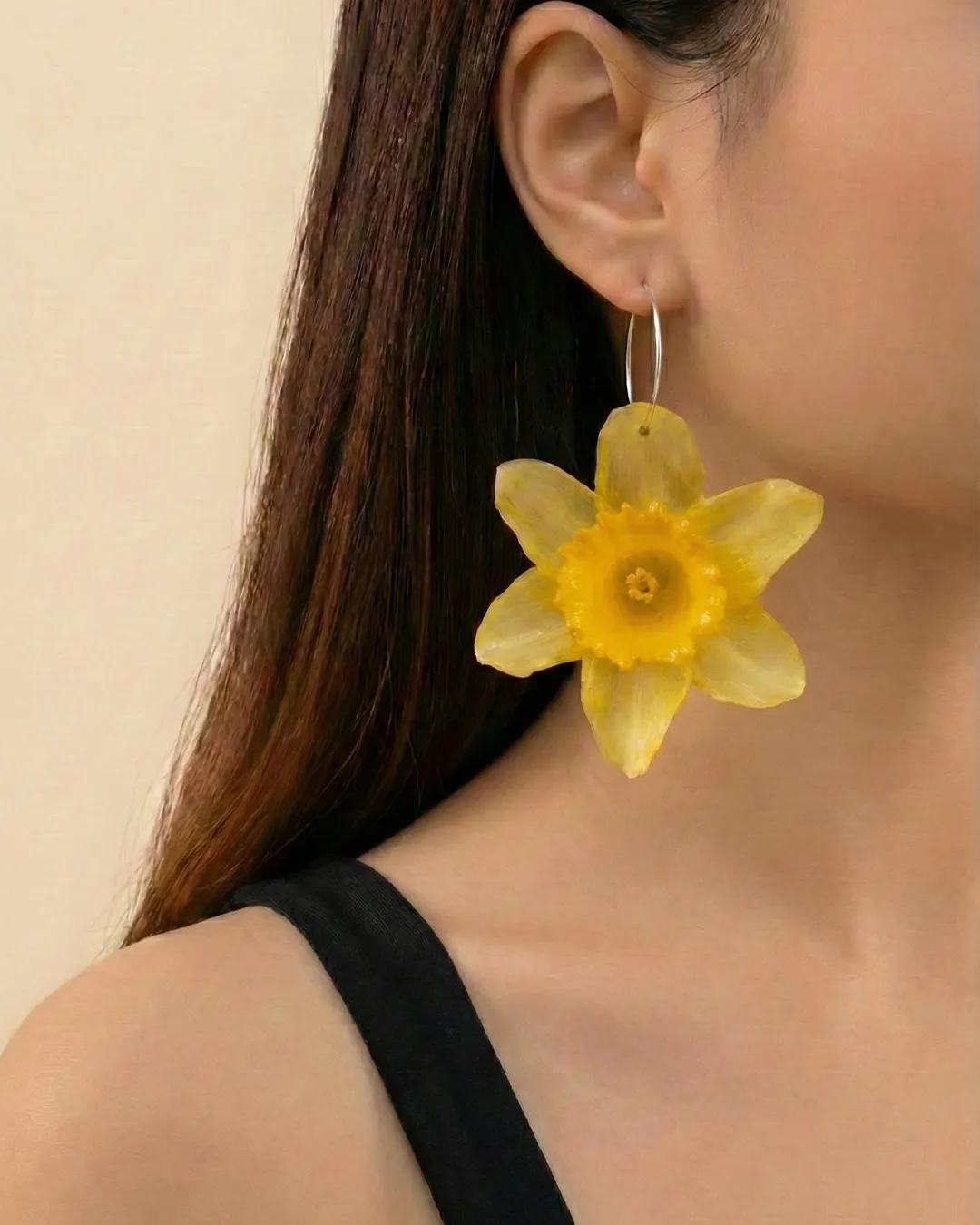 Natural daffodil hoop earrings with sterling silver hoops, preserved real petals and vivid spring color, perfect for daily use, wedding, and date styling.